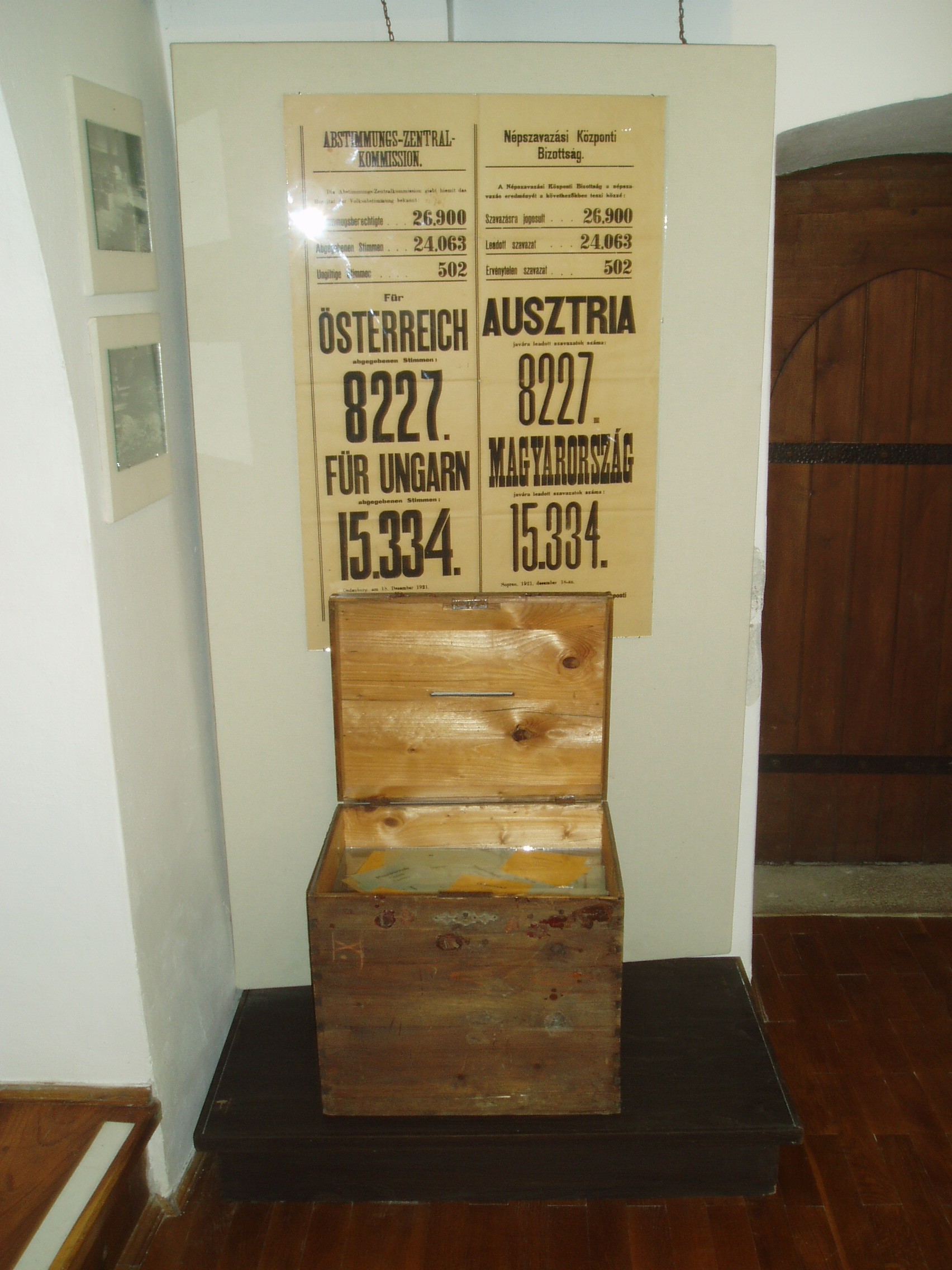 Nyilvános 1306 | 1554 | Fő tér 8. Storno-ház | Sopron városközpontjának egyik szép műemléke a középkori eredetű kétemeletes Storno–ház, amely mai formáját 1720 körül kapta. A történelmi múltú házban 1482-1483 telén hosszabb ideig tartózkodott Mátyás király, innét intézte bécsi hadjáratának ügyeit. Az eseményt a homlokzaton emléktábla örökíti meg. Az épület 1698-tól 1872-ig a Festetich család tulajdona volt. 1872-ben id. Storno Ferenc festőművész, restaurátor vette meg családi otthonnak, s itt helyezte el műgyűjteményét. A Storno–ház ma múzeum. Első emeletén a Soproni Múzeum várostörténeti kiállítása kapott helyet. A második emeleten a ház egykori lakói, id. és ifj. Storno Ferenc által gazdagon dekorált és berendezett helyiségek tekinthetők meg. A képen a Sopron sorsát eldöntő népszavazás eredményét közzétevő korabeli plakát látható. A kép 2008 júniusában készült. Felh.irod.: Czellár Katalin: Sopron. 3. jav. kiad. Bp. Panoráma, 2000 Askercz Éva: Storno–gyűjtemény. Bp. TKM 1987 /Tájak–Korok–Múzeumok Kiskönyvtára 276./ |