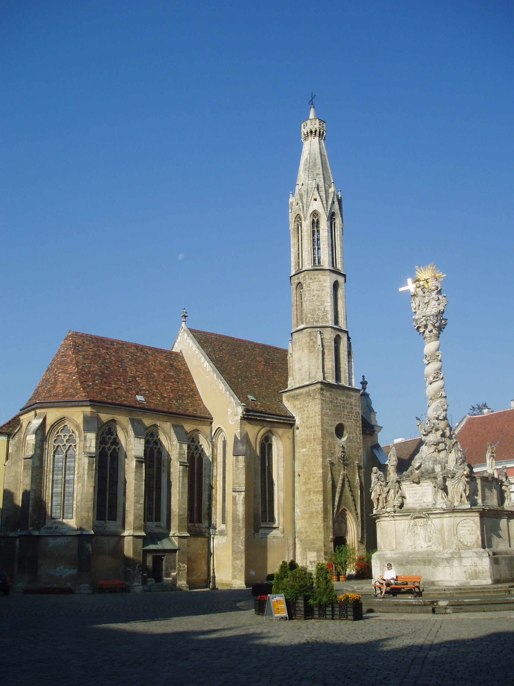 Nyilvános 1313 | 1738 | Sopron, Fő tér: Kecske-templom | A soproni Fő tér ékességét, a gótikus Kecske–templomot és a hozzá tartozó ferences kolostort a XIII. század második felében kezdték építeni. Tornya a XIV. század első negyedében készült el; mai alakja id. Storno Ferenc 1888–1894 között végzett helyreállításának eredménye. Szokatlan nevét a kapuzat felett látható faragott állatfiguráról kapta (a ma látható kecske Storno Ferenc faragványa, az eredeti a Káptalanteremben van), amelyről kiderítették a kutatók, hogy az építtető Gaisel család címerállata volt. Maga a templom faragott kőből épült, háromhajós, északi oldalán toronnyal díszített kora gótikus épület, berendezése a későbbi századokból származó barokk, illetve rokokó stílusú. Déli hajójának közepén áll egy XV. századból származó, márványból készült szószék. Ebbe ágyazták bele azt a fából faragott szószéket, amelyről állítólag Kapisztrán János prédikált a templom előtt a török ellen. A templom többször volt színhelye országos jelentőségű ünnepségeknek, reprezentációs alkalmaknak: 1553 és 1681 között öt alkalommal falai között tartották az országgyűlési ünnepeket; 1625-ben királyt (III. Ferdinánd), 1622-ben és 1681-ben királynét koronáztak benne. 1787-ben feloszlatták a ferences rendet, s az épületegyüttest később a bencések kapták meg. A fénykép 2008 júniusában készült. Felh. irod.: Czellár Katalin: Sopron. 3. jav. kiad. Bp. Panoráma, 2000 Albert Tibor: Sopron–Vas vármegyei útikönyv. Magyar múlt — osztrák–magyar jelen. Kőszeg, Városkapu Kiadó, 2005 |