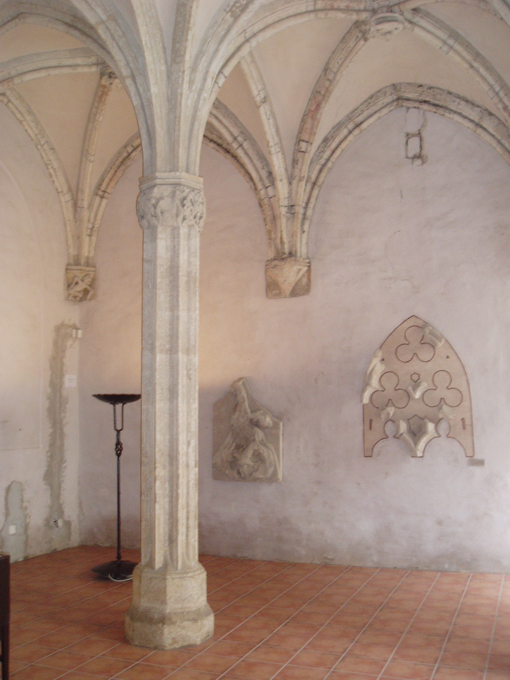 Nyilvános 798 | 1560 | Sopron, Fő tér: Kecske-templom - Káptalanterem | A Kecske–templomhoz a Templom utca felől kapcsolódik az egykori bencés rendház két udvart körülfogó, kétemeletes, nagy tömegű, de igénytelen külsejű épülete. A templommal együtt a ferencesek számára épült a XIV. században, majd 1802-ben a bencések kapták meg. E hajdani kolostor tartozéka a látogatók számára a templomból megközelíthető Káptalan–terem, Sopron város egyik legszebb gótikus műemléke. A háromhajós terem gótikus keresztboltozatait két karcsú nyolcszögletes pillér támasztja alá. A hajókhoz kelet felől egy–egy kápolnaszerű bővület csatlakozik, amelyeket pilléreken nyugvó csúcsíves árkád választ el a teremtől. A fénykép 2008 júniusában készült. Felh. irod.: Czellár Katalin: Sopron. 3. jav. kiad. Bp. Panoráma, 2000 |
