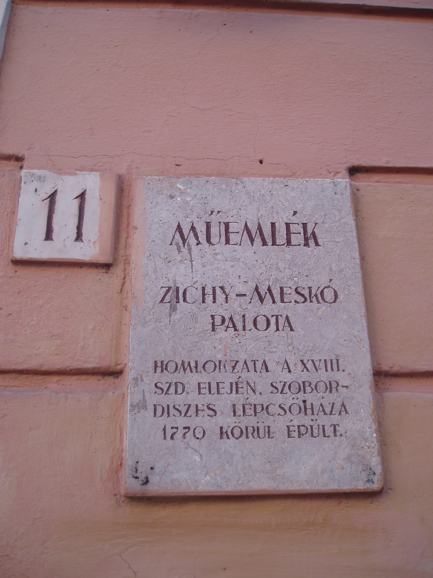 Nyilvános 939 | 1465 | Sopron, Kolostor utca 11. Zichy-Meskó-palota | A kétemeletes barokk lakóház két utcára nyílik, hátsó homlokzata az Új utcában van. A homlokzatok 1726 körül készülhettek, a díszes nagyterem és a lépcsőház pedig az 1770-es években. Ekkoriban a Meskó család volt a tulajdonos. 1816-ban Niczky Lajos, Sopron vármegye alispánja vette meg, majd 1828-ban Zichy Miklós, ő 1850-ben Meskó Máriának adta el. E két család később házassági kapcsolat révén 1945-ig birtokolta a kis palotát. Az épületbelsőben háromkarú díszlépcső vezet az emeletre. A lépcsőt az első emeletig a Szerencse, az Erő, az Igazság és a Tudomány szimbolikus nőalakjainak szobrai kísérik. Két emelet magas dísztermének mennyezetét freskó ékesíti. A fogadószoba falát faragott faburkolat borítja. A két, 1740 körül készült festmény Meskó Jakabot és feleségét ábrázolja. A fénykép 2008 júniusában készült. Felh. irod.: Czellár Katalin: Sopron. 3. jav. kiad. Bp. Panoráma, 2000 |