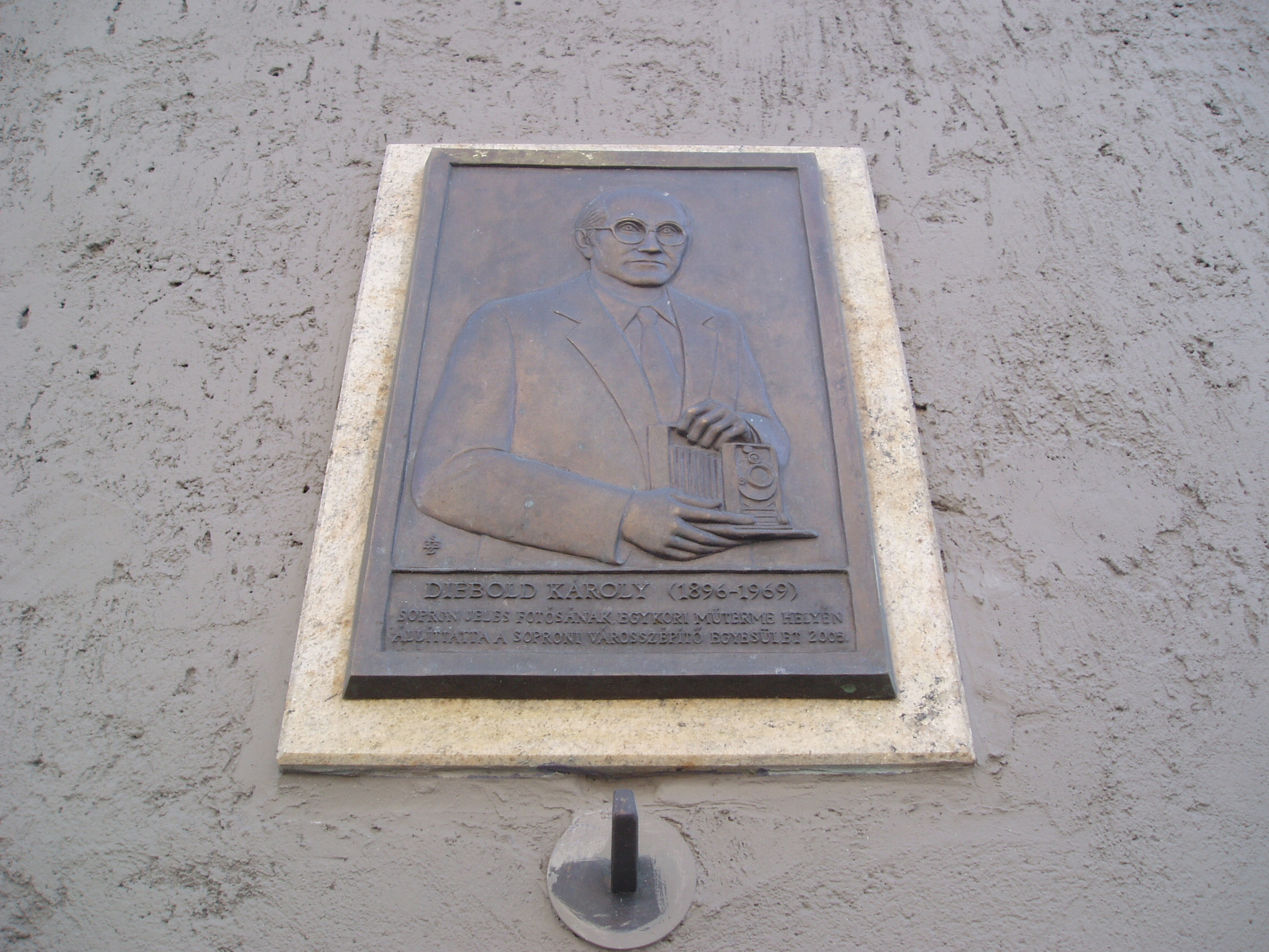Nyilvános 1373 | 1929 | Sopron, Móricz Zsigmond utca 2. | A Móricz Zsigmond és a Mátyás király utca sarkán álló épületen emléktáblát helyeztek el Diebold Károly tiszteletére. A város jeles fotóművészének egykor itt volt a műterme. Diebold Károly (1896-1969) Sárszentmiklóson született, de tíz hónapos korától haláláig Sopronban élt. Az első világháborúban teljesített katonai szolgálata után a József Műegyetemre iratkozott be, Budapestre. Tanulmányait a család nehéz anyagi helyzete miatt nem tudta befejezni, ezért visszatért Sopronba. Néhány év elteltével a gyermekkori szerelem, a fényképezés már megélhetését is biztosítani tudta, 1931-ben önálló fotóműtermet nyitott. A II. világháború után a soproni egyetemen helyezkedett el, ahol megalakította és vezette az egyetemi fotólaboratóriumot. Aktív élete végéig itt tevékenykedett, számos rangos kiadványt gazdagítva felvételeivel. A kép 2008 júniusában készült. Felh. irod.: http://www.museum.hu/museum/temporary_hu.php?IDT=4321&ID=368 |