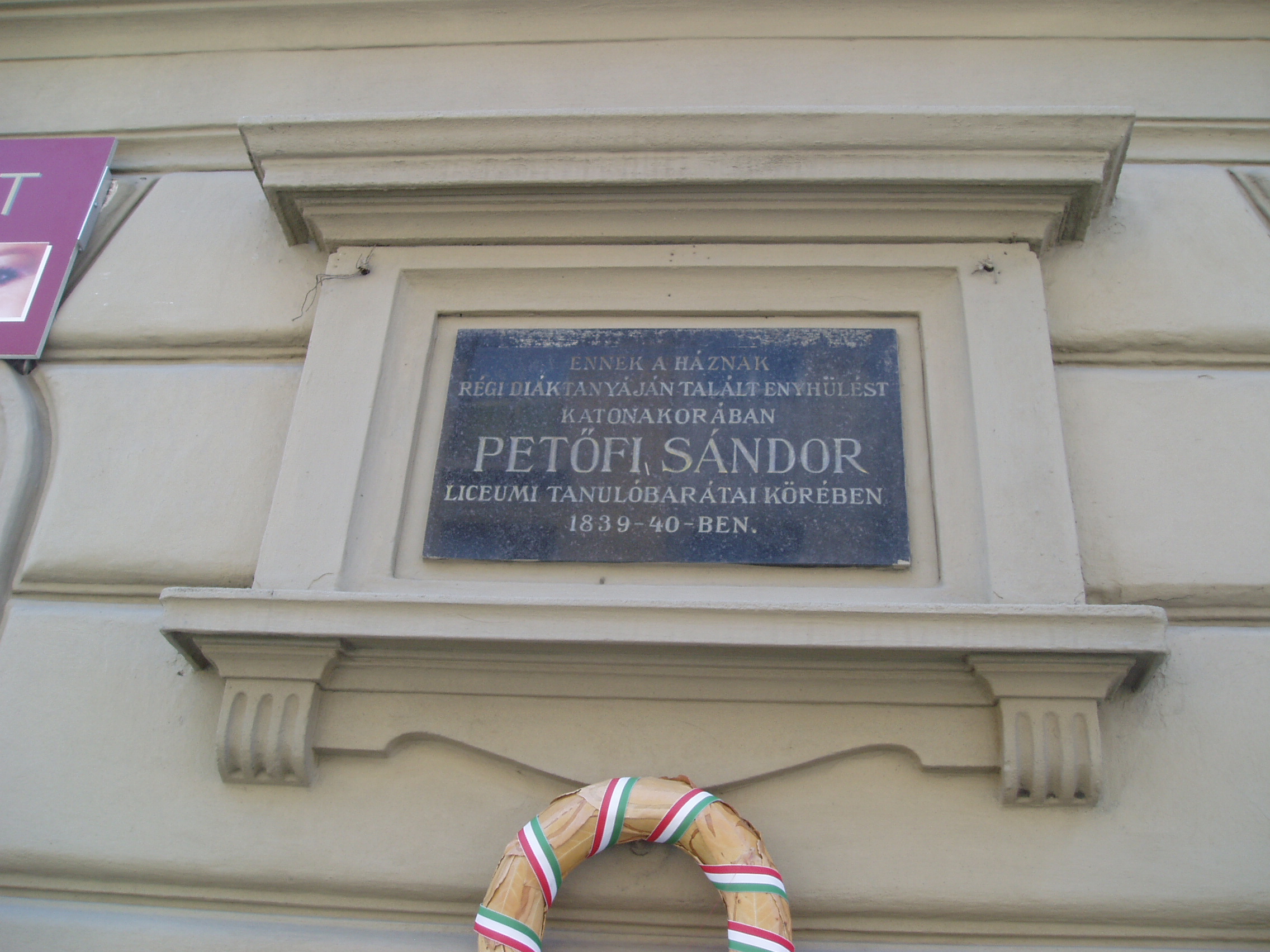 Nyilvános 936 | 1376 | Sopron, Rákóczi utca 9. | Az épület homlokzatán elhelyezett emléktábla tanúsága szerint ennek a háznak régi diáktanyáján többször járt baráti társaságban soproni katonaidejének nehéz korszakában Petőfi Sándor 1939/40-ben. A kép 2008 júniusában készült. |