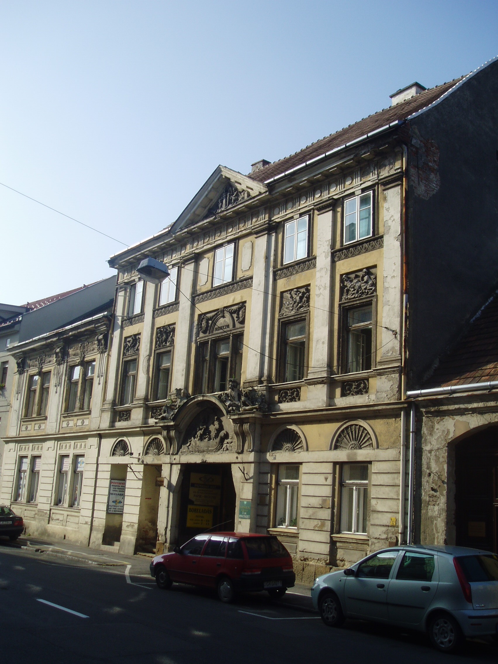 Nyilvános 1324 | 1706 | Sopron, Rákóczi utca 39. | A kétemeletes, klasszicista stílusú lakóház 1816-ban Hild vencel tervei szerint Lenk Sámuel nagykereskedő számára épült gazdag szobrászati díszítésekkel. Az övpárkány és a kapu felett a Lenk kereskedőcsalád cégére, két mór faragott figurája látszik. A kő dombormű a csodálatos halászatot ábrázolja. A kép 2008 júniusában készült. Felh. irod.: Czellár Katalin: Sopron. 3. jav. kiad. Bp. Panoráma, 2000 |