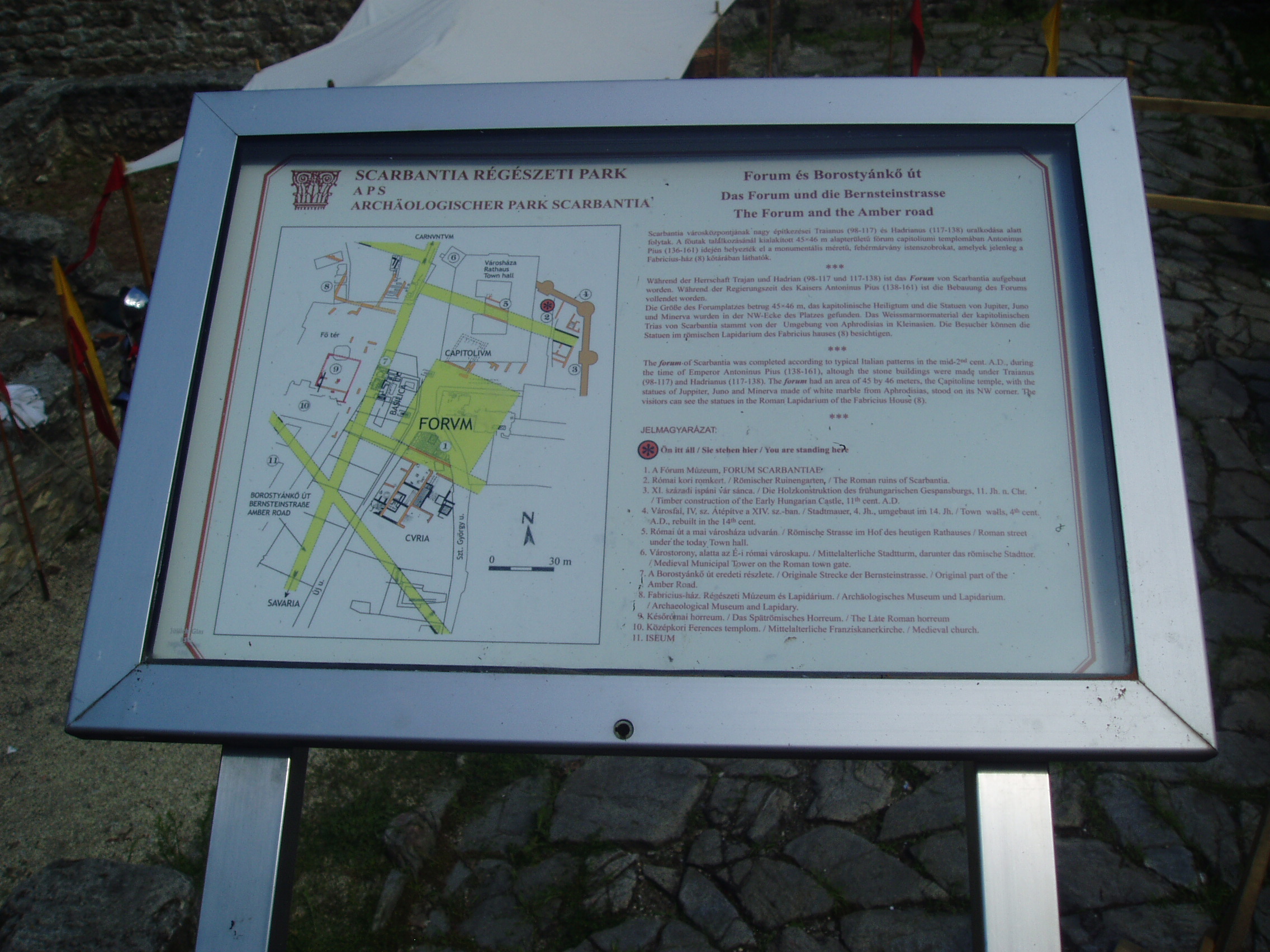 Nyilvános 1301 | 1656 | Sopron, Scarbantia Régészeti Park | Az egykori Római Birodalom Pannónia provinciájának egyik határállomása Scarbantia, a mai Sopron volt. A római oppidum központjának, a fórumnak legfontosabb épületét - a capitoliumi templomot - 1893 telén a városháza építésekor találták meg. Az 1960- és 1970-es évek ásatásaival végül sikerült meghatározni a fórum teljes kiterjedését és elhelyezkedését. A mai belváros szívében feltárt maradványokat - kiegészítve a a XI. századi ispáni vár feltárt sáncával - nagyszabású szabadtéri régészeti kiállítás keretében, térképekkel, ismertetőszövegekkel kellően ellátva szemlélheti meg a városnéző. A kép 2008 júniusában készült. |