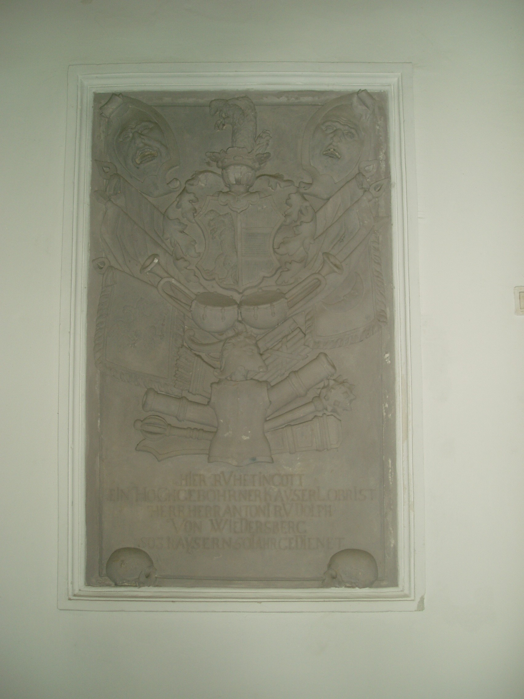 Nyilvános 937 | 1410 | Sopron, Szent György utca 7. Szent György-templom | A Káptalan-házhoz azonos házszámmal csatlakozik a Szent György-templom. Az 1380–1430 között épült, eredetileg gótikus templom mozgalmas, olaszos homlokzata a XVII. századból származik, de rajta két gótikus dombormű máig megőrződött. Kisebb mértékben az 1760-as években is átalakították. Eklektikus tornya 1882-ben épült. Az egyhajós templomot az 1676-os tűzvész után több lépésben alakították át: a csúcsíves lezárású főhajót gazdag stukkóval díszítették, és két oldalán kápolnasorral keretezték. A szentély melletti keresztelőkápolnában középkori freskótöredéket látni. Az 1705–1706 között készült stukkódísz Pietro Antonio Conti műve, és berendezése is XVIII. századi. A képen egy bizonyos Anton Rudolph von Wiedersberg címerrel és hadijelvényekkel díszített sírköve látható (1737), az Utolsó Ítélet-kápolnában. A kép 2008 júniusában készült. Felh. irod.: Czellár Katalin: Sopron. 3. jav. kiad. Bp. Panoráma, 2000 http://www.domsopron.hu |