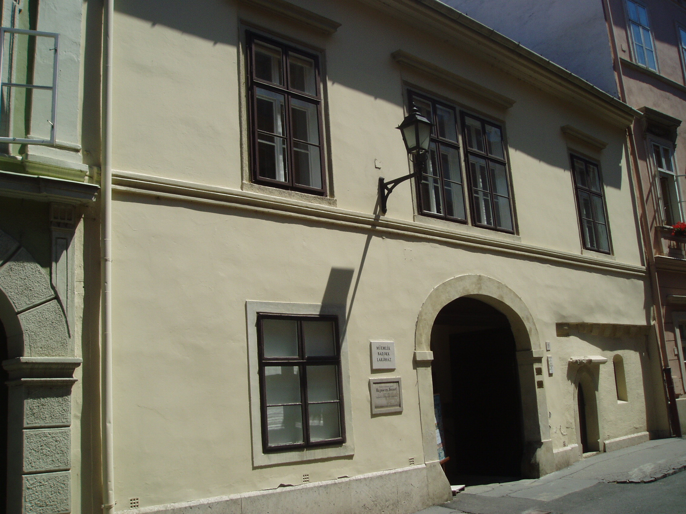 Nyilvános 1327 | 1543 | Sopron, Templom utca 19. | Középkori eredetű, egyszerű, egyemeletes lakóház. 1734-ben Hajnóczy Dániel, a neves tanár és hitszónok tulajdona volt. Az épületen emléktábla hirdeti, hogy ebben a házban lakott Hajnóczy József (1750-1795) jogtudós, felvilágosult gondolkodó, aki részt vett a Martinovics-féle összeesküvésben, amiért Budán lefejezték. A kép 2008 júniusában készült. Felh. irod.: Czellár Katalin: Sopron. 3. jav. kiad. Bp. Panoráma, 2000 |