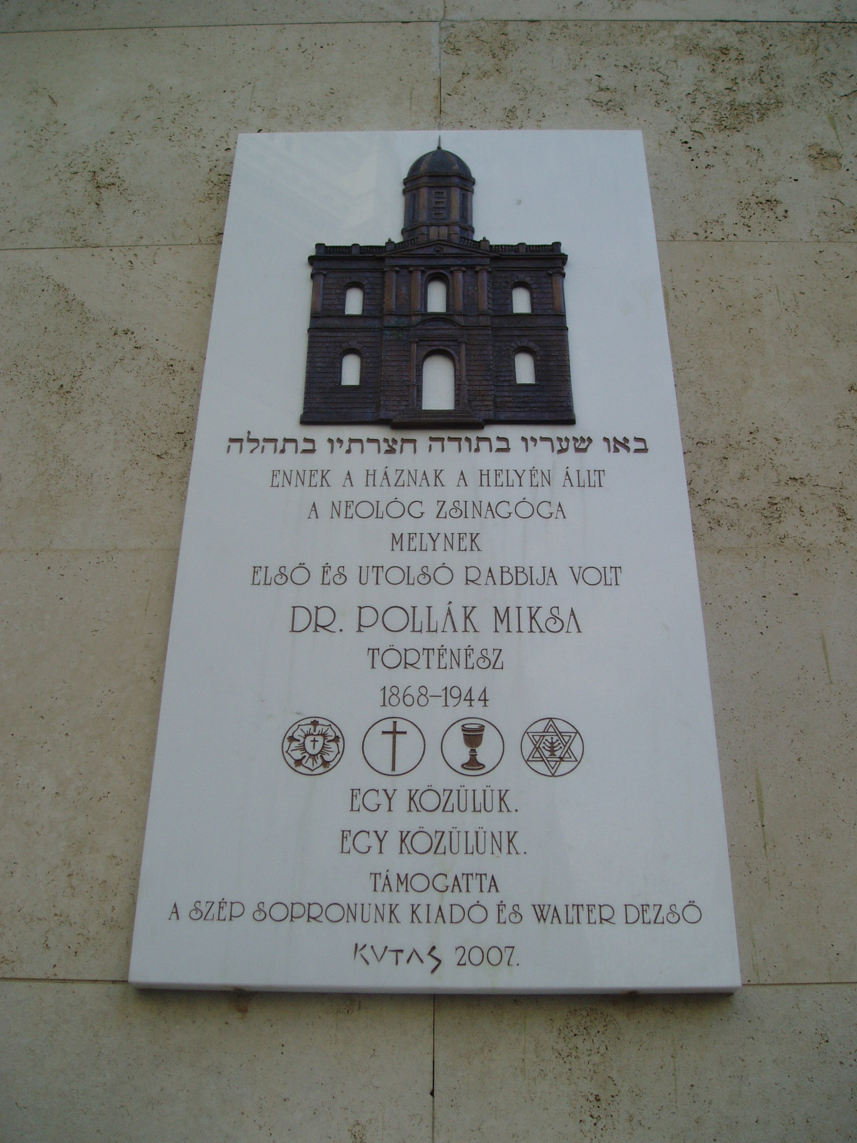 Nyilvános 1357 | 1746 | Templom utca 23. | Egykor ezen a helyen állt a neológ zsinagóga, amelyet Schámár János épített neoreneszánsz stílusban. Első és utolsó rabbija dr. Pollák Miksa (1868-1944) volt, aki történészként megírta a soproni zsidóság történetét. A mostani lakóházat Winkler Oszkár tervezte, 1960-ban épült fel. A neológ zsinagóga emléktáblája mellett az épületen egy másik tábla Pap Károly író alakját idézi fel, aki 1897. szeptember 24-én itt született, Pollák Miksa fiaként. A magyar irodalom egyik legeredetibb hangú prózaírója a buchenwaldi haláltáborban pusztult el. A kép 2008 júniusában készült. Felh. irod.: Czellár Katalin: Sopron. 3. jav. kiad. Bp. Panoráma, 2000 Hegedűs Géza: A magyar irodalom arcképcsarnoka. Bp. Trezor, 1992 |