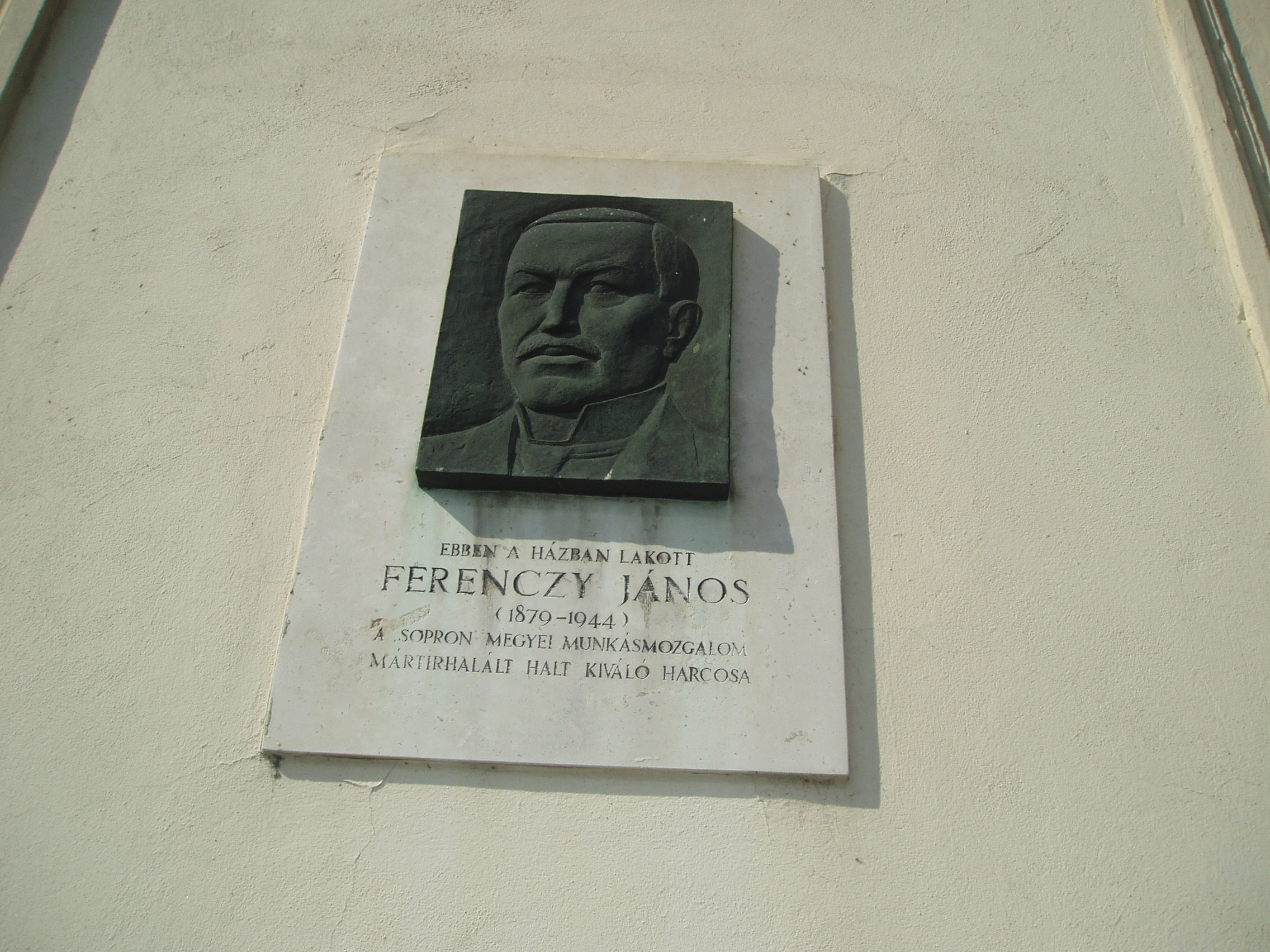 Nyilvános 1355 | 1647 | Sopron, Újteleki utca 54. | Az épületen domborműves tábla idézi Ferenczy János (1870-1944) alakját. Egykor ebben a házban lakott a sopron megyei munkásmozgalom mártírhalált halt kiváló harcosa. A kép 2008 júniusában készült. |