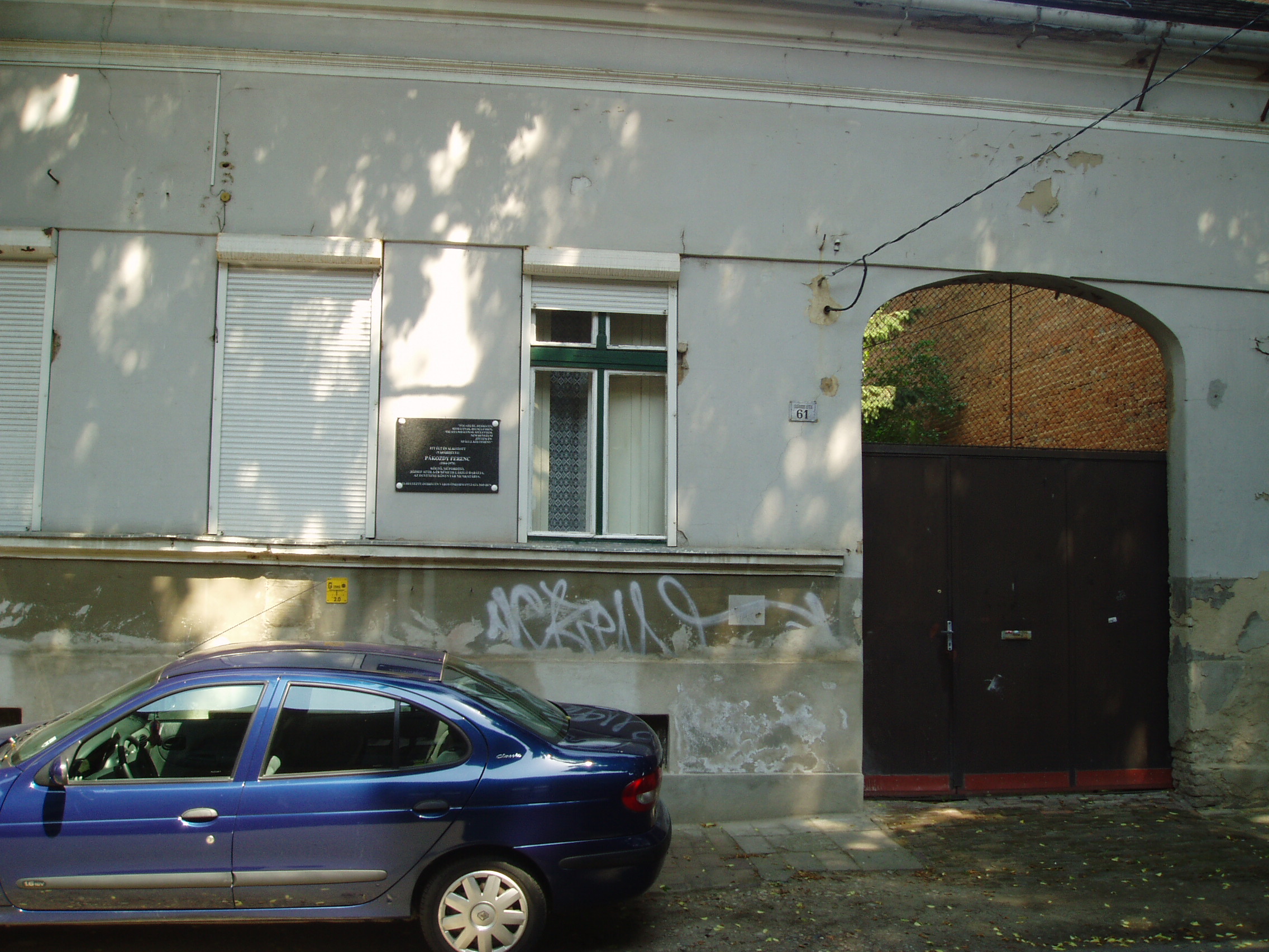 Nyilvános 1466 | 1967 | Debrecen, Darabos utca 61. | Mint az épületen elhelyezett fekete márványtáblán olvasható, ebben a házban élt és alkotott Pákozdy Ferenc (1904-1970) költő, műfordító, az Egyetemi Könyvtár munkatársa. Orvosnak készült, majd jogot hallgatott, jog- és államtudományi doktorátust szerzett. 1928–1944 között újságíró volt különböző lapoknál. 1945 után szülővárosában, Hódmezővásárhelyen dolgozott. 1952-től élt Debrecenben. A harmincas években József Attila pártfogója és értő kritikusa volt, költészete mellett a Külvárosi éj című verséről írott recenziójában állt ki (megjelent a hódmezővásárhelyi Hétfői Újságban 1933. jan. 2.án). A fénykép 2006 júniusában készült. Felh. irod.: Magyar életrajzi lexikon |