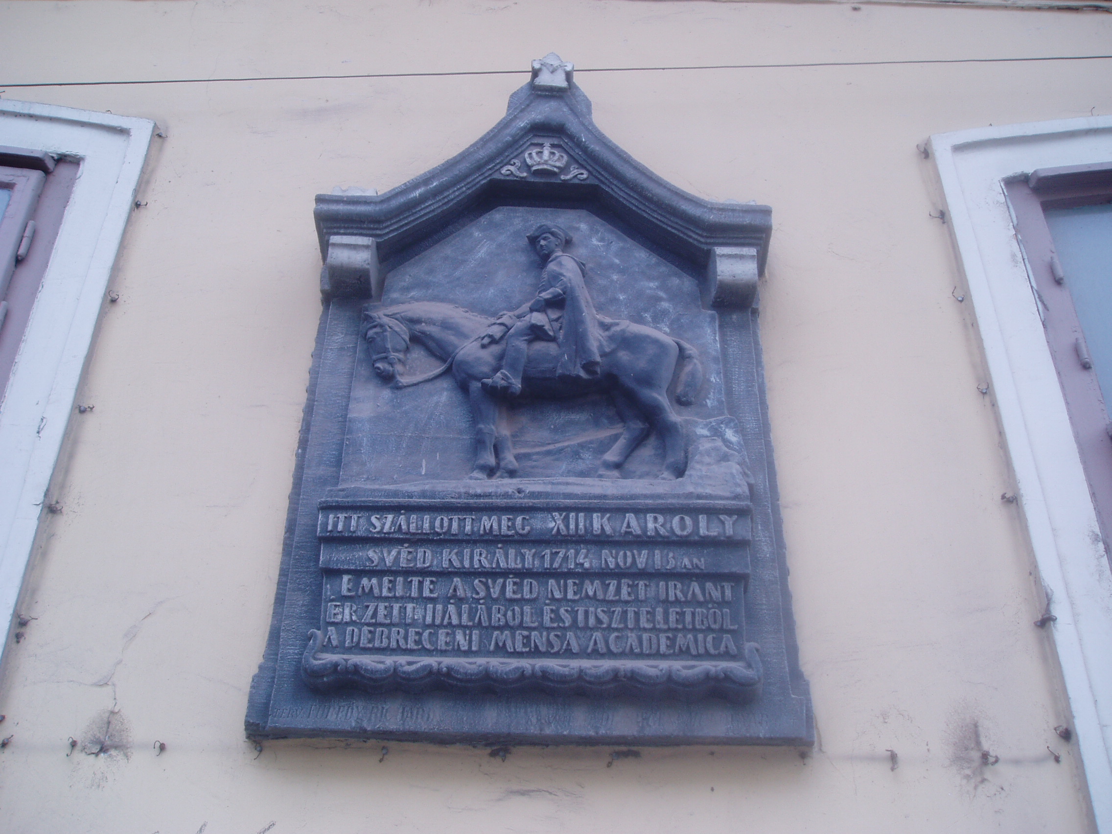 Nyilvános 1439 | 1868 | Debrecen, Széchenyi utca 6. | Debrecen legrégibb fennmaradt lakóháza az 1690-es években emelt patríciusház. A 17. század végén már Diószegi Sámuelé, a város főbírájáé, s első postamesteréé is volt. A ház így fogadóként is szolgált. Legnevezetesebb vendége XII. Károly svéd király volt, aki itt szállt meg 1714. november 16-án, amikor Törökországból hazafelé tartott az I. Péter orosz cártól elszenvedett vereség után. Az egykorú források megőrizték, hogy a király, aki nemcsak híres hadvezér és államférfi volt a maga korában, hanem felvilágosult gondolkodó is, igazi lelki gyönyörűséget talált a debreceni főbíró házánál, ahol a kollégium professzoraival, a nagy műveltségű, világot járt házigazdával és más olvasott férfiakkal találkozott. A továbbutazó király elégedetten jegyezte fel, hogy itt, a távoli magyar városban igen jól felszerelt és gazdag könyvtár állt rendelkezésére esti olvasás céljából. Felh. irod.: Papp Antal: Debrecen. Bp. Panoráma, 1976 www.debrecen.hu |