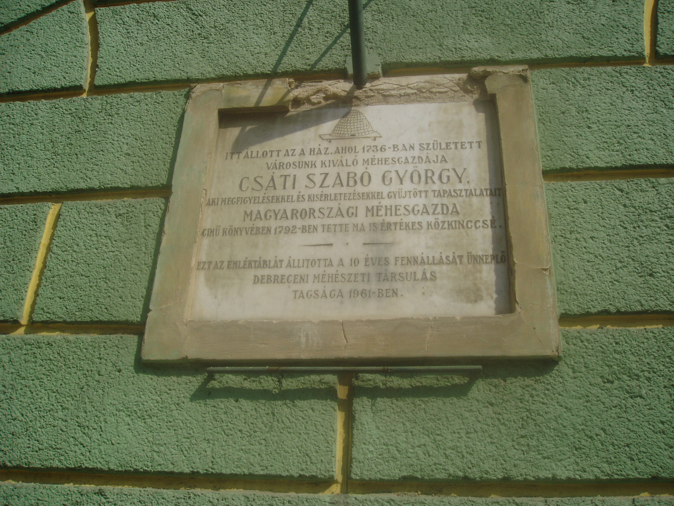 Nyilvános 1880 | 3778 | Debrecen, Csapó utca 1. | A mostani épületen emléktábla adja tudtul, hogy az egykor ezen a helyen állott házban született 1736-ban Csáti Szabó György, Debrecen kiváló méhesgazdája. A fénykép 2006 júniusában készült. |