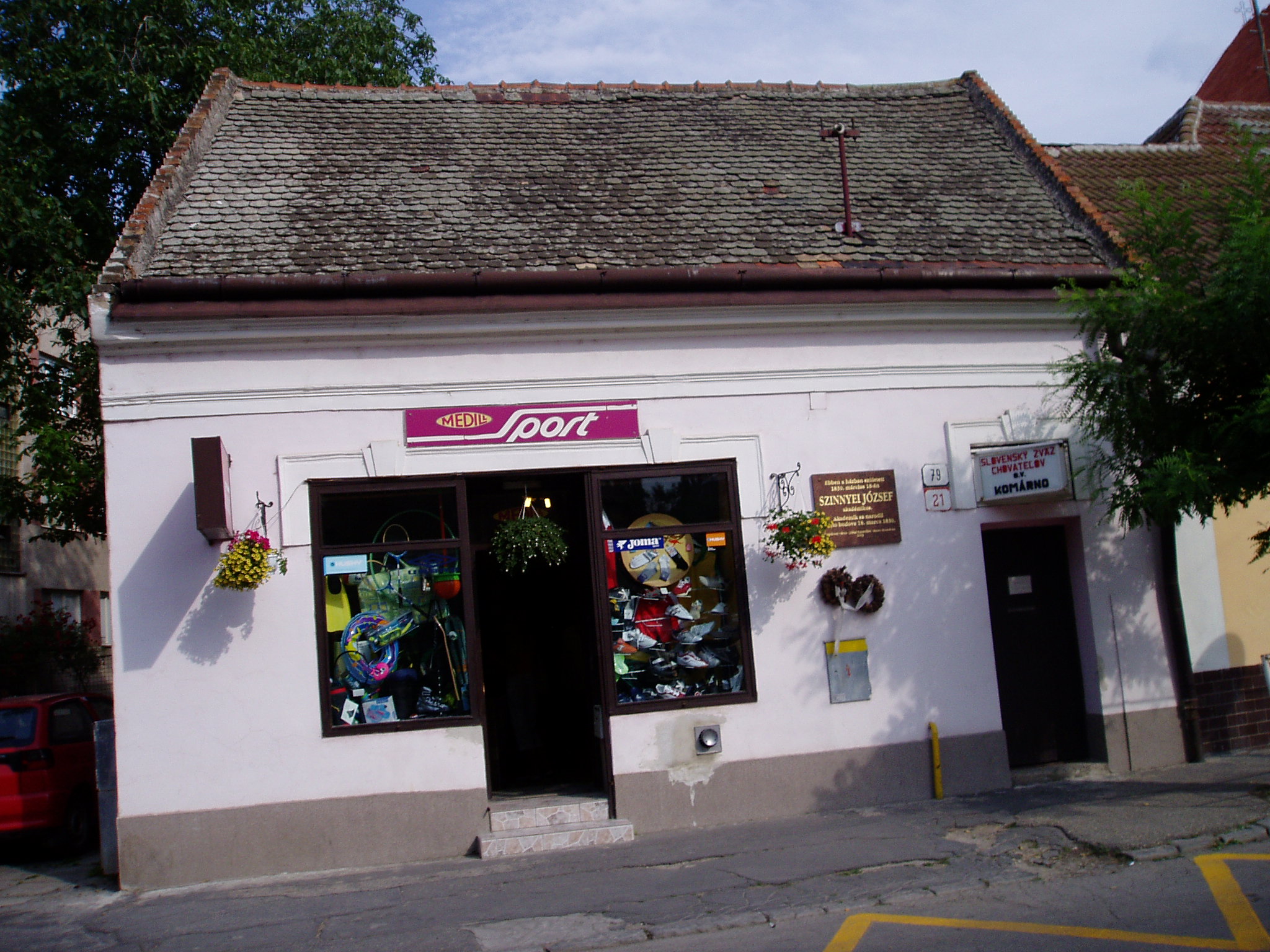 Nyilvános 1957 | 4274 | Komárom (Komárno), Ferences barátok u. 21. | Mint a kis házon elhelyezett emléktáblán is olvasható, ebben a házban született 1830. március 18-án Szinnyei József bibliográfus, könyvtáros, irodalomtörténész, akadémikus. Legfontosabb műve a Magyar írók élete és munkái, mely közel 30.000 író részletes életrajzát illetve kiadott műveinek jegyzékét tartalmazza, s ma is nagyon fontos forrásmunka. A fénykép 2005. júliusában készült. Felh. irod.: Mácza Mihály: Komárom nevezetességei. Pozsony, Madách-Posonium, 2002 |