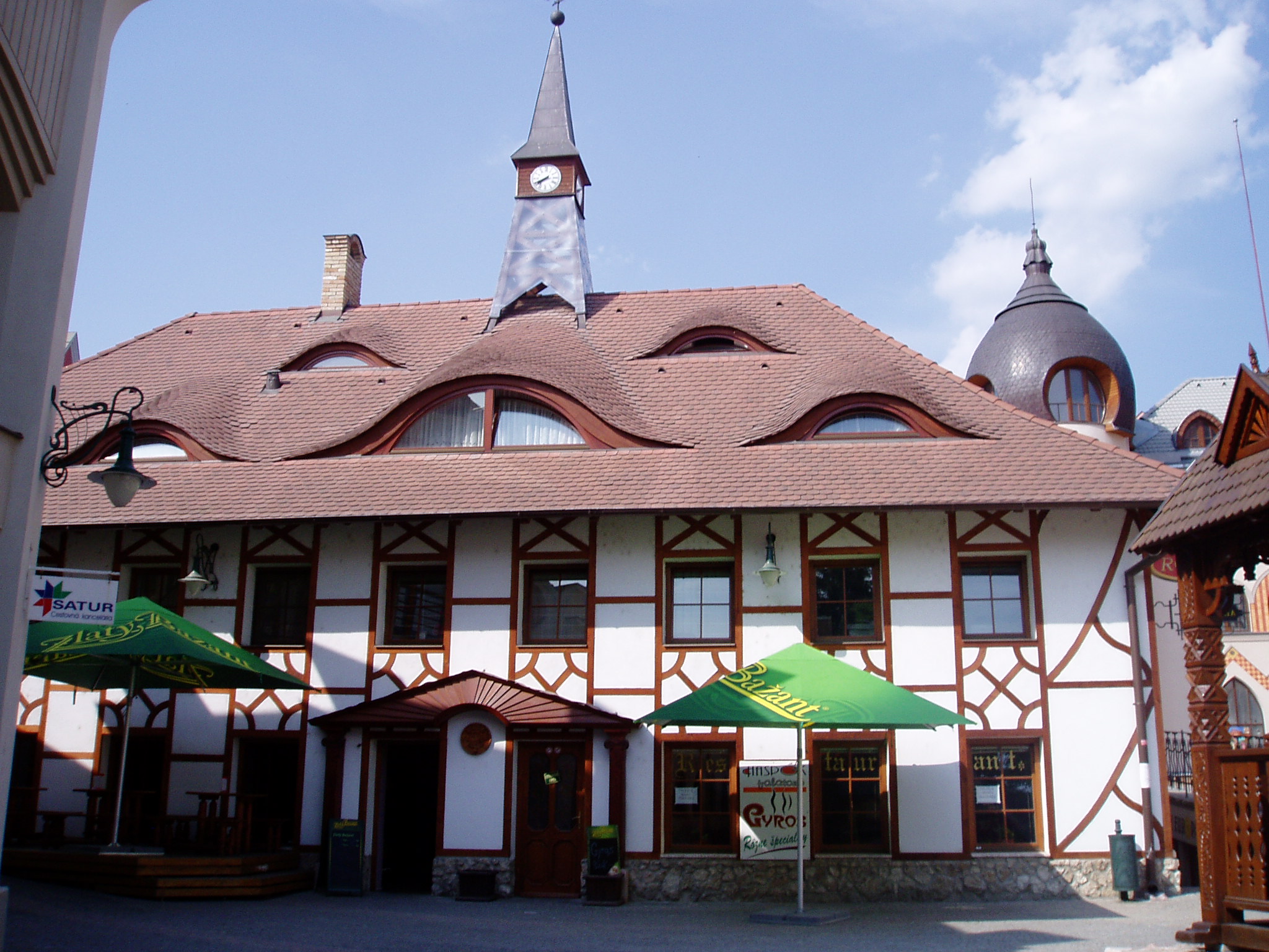 Nyilvános 1895 | 5298 | Komárom (Komárno), Európa udvar | A közelmúltban a Zichy–palota (lásd: Klapka tér 9.) udvarán építették ki az ún. Európa udvart. A helyi viszonylatban gigantikus méretű vállalkozás célja, hogy élőben mutassa be harmincöt európai ország építészetét. A városrész egyben Komárom új szolgáltató központja is, üzletekkel, éttermekkel, kávézókkal, valamint egy föld alatti bevásárlóközponttal. A fénykép 2005. júliusában készült. Felh.irod.: www.komarno.sk Mácza Mihály: Komárom nevezetességei. Pozsony, Madách-Posonium, 2002 |