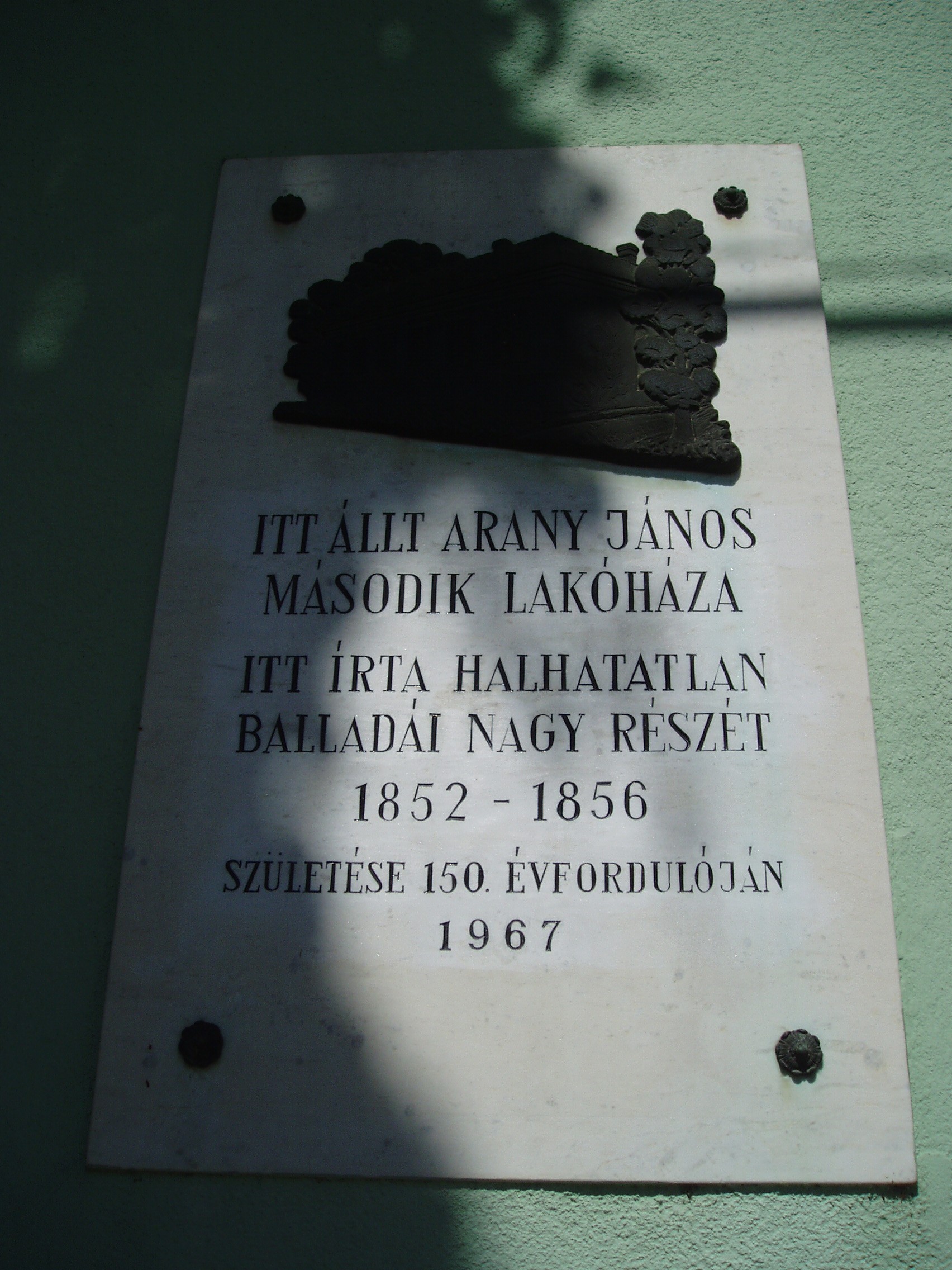 Nyilvános 1944 | 4036 | Nagykőrös, Arany János utca 27. | Ezen a helyen egykor szép kúria állott. Ebben volt nagykőrösi évei alatt Arany János második lakása 1852-1856 között. Itt írta halhatatlan balladái nagy részét, itt fejezte be a Toldi estéjét. A telek szomszédos volt a Gubody-házzal, s így meleg barátság szövődött Aranyék és az előkelő földbirtokos család között. Arany János felesége, Piroska lánya, majd veje, Széll Kálmán is hosszú évtizedekig kapcsolatban állottak a Gubody-család tagjaival, akik több értékes Arany-ereklyét is megőriztek. Aranyéknál járt látogatóban Tompa Mihály (1852, 1859); többször megfordult Aranynál az ifjú Gyulai Pál és 1856. aug. 20-án itt adta át neki a később híressé vált Kapcsos könyvet; járt itt vendégségben Jókai Mór is (1853 karácsony). A mostani házat 1967-ben jelölték meg emléktáblával. A fénykép 2006 augusztusában készült. Felh. irod.: Novák LászlÓ Arany János Múzeum. Nagykőrös, 2000 Törös László: A nagykőrösi Arany emlékek katalógusa. = A nagykőrösi művelődés hármas kis tüköre. Nagykőrös, 1935 |