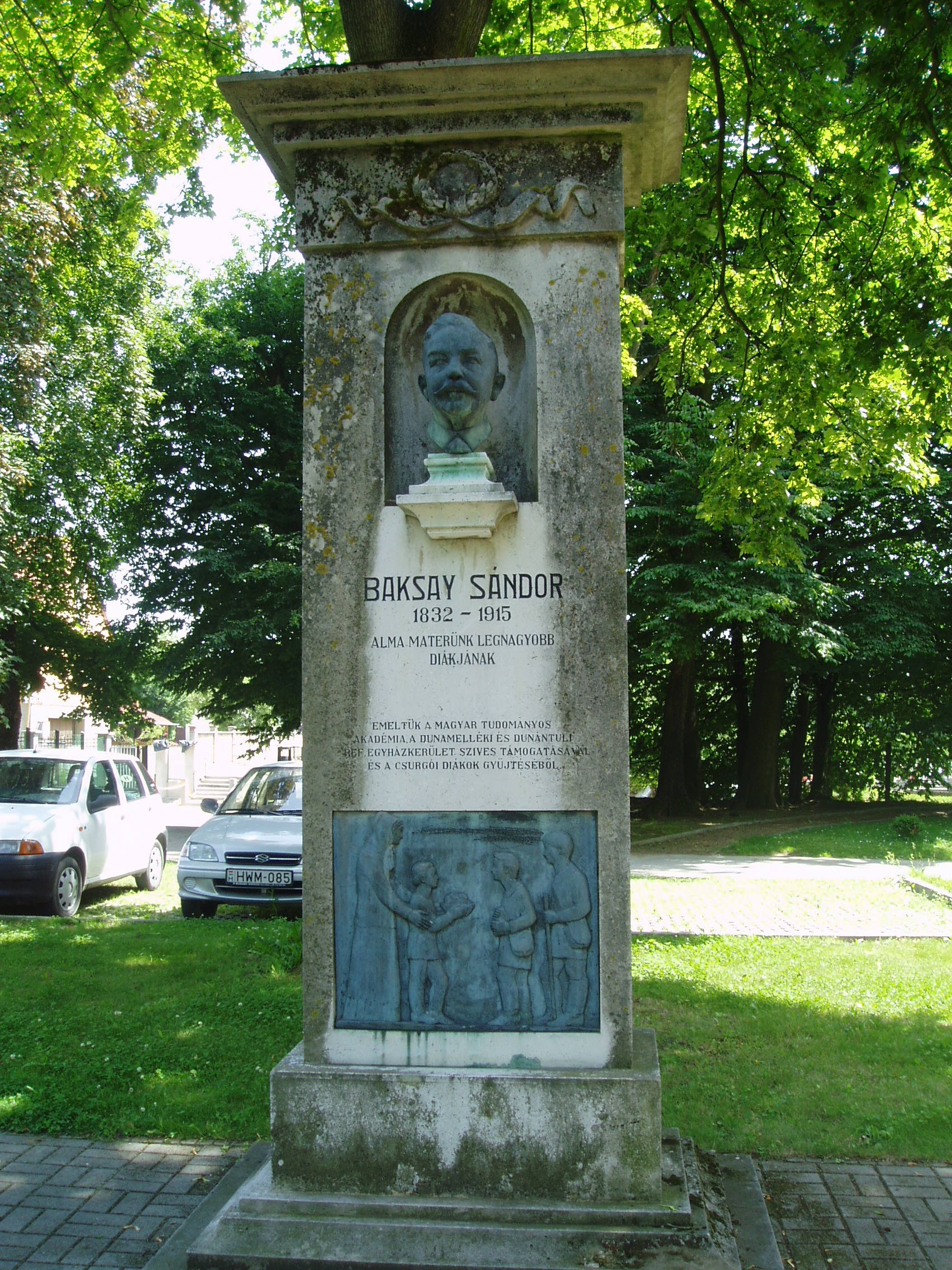 Nyilvános 990 | 1907 | Csurgó, Széchenyi tér 9. Baksay István emlékműve | A Csokonai Vitéz Mihály Református Gimnázium és Általános Iskola mai épülete az egykori vadasparkban áll. A nagy kiterjedésű, 4 hektárnyi parkban nyolcvan féle, ritkaságszámba menő növényfaj él. A látogatót együttesen ragadja meg a patinás iskola látványa, a hatalmas ősfák közötti sétányok hangulata és a neves egyéniségek tiszteletére állított emlékek együttese. Baksay Sándor egykori csurgói diák emlékoszlopát, amelyet Jálics Ernő tervezett, 1939-ben állították fel a parkban. Kis fülkében portrészobra látható; alatta tisztelgő felirat s az író "Nagymama karácsonyja" című elbeszéléséből származó idézet olvasható. Az emlékművet Áprily Lajos költő avatta fel. Baksay Sándor (1832-1915) 1839-ben lett a csurgói gimnázium diákja. Fontos szerepet játszott a gimnázium reformkori történelmében az önképzőkör megalapításával. Elbeszélésekben és visszaemlékezéseiben is megörökítette az akkori Csurgót és gimnáziumát. Az Osztrák-Magyar Monarchia írásban és képben című könyvsorozatban ő ismertette Somogy megyét. A fénykép 2004 októberében készült. Felh. irod.: Horváth József: Csurgó. Műemlékek. Bp. Tájak, Korok, Múzeumok Kiskönyvtára 441. 1982 Csurgói kalauz. Szerk. Terényi Zoltán. 1974 Látnivalók Somogy megyében. Miskolc, Well-PRess Kiadó, 2000 www.vendegvaro.hu |