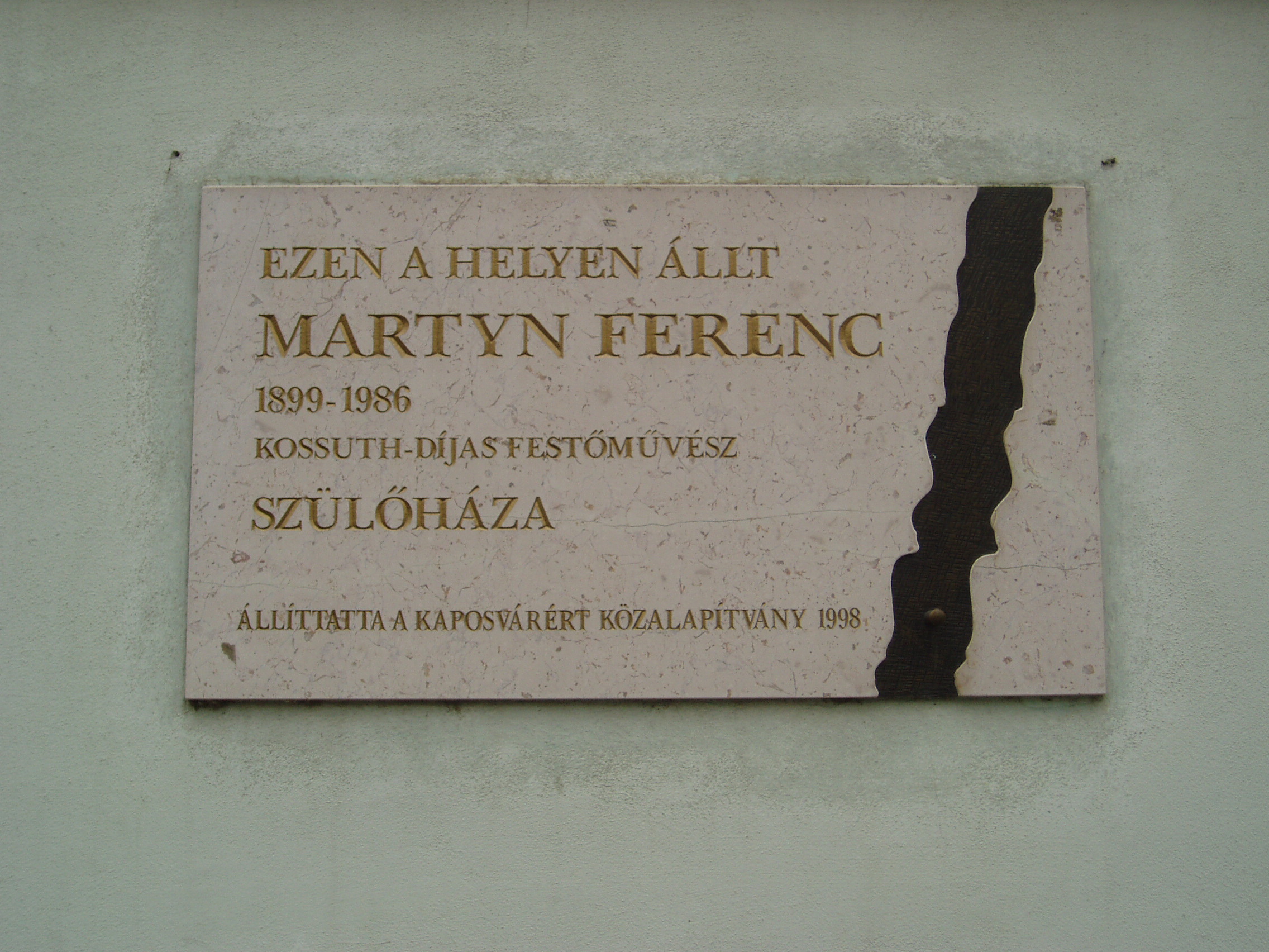 Nyilvános 1010 | 1758 | Kaposvár, Fő utca 70. | A mostani épület helyén egykor állott házban született 1899. június 10-én Martyn Ferenc (1899-1986) festőművész. Emléktábláját 1998-ban avatták fel. Rokona volt Rippl-Rónai Józsefnek, unokája Piacsek bácsinak, Rippl-Rónai egyik kedvelt modelljének. Édesnyja halála után gyermekkorát - fivérével, a legendás orvossá lett Martyn Róbert Alajossal együtt - Rippl-Rónai házában (lásd: Kaposvár, Róma-villa) töltötte. A fénykép 2006 márciusában készült. Felh. irod.: Martyn Ferenc: Visszaemlékezések Rippl-Rónai Józsefre. = Somogyi Almanach 3. Szerk. Kanyar József. Kaposvár, 1958 |