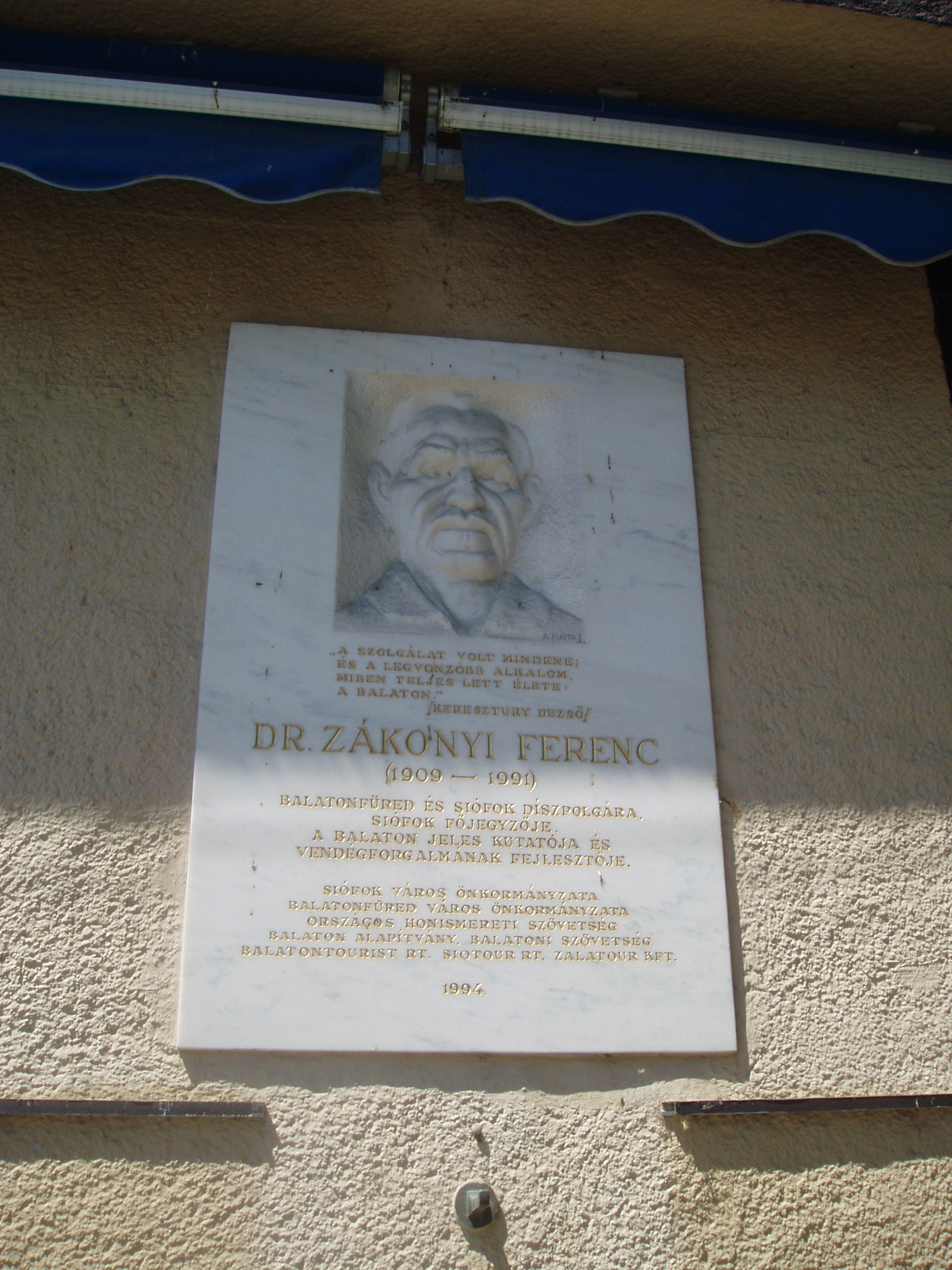 Nyilvános 1475 | 2259 | Siófok, Szabadság tér 6. | A Siotour Rt. főirodájának épületén, egykori munkahelyén 1994-ben avatták fel dr. Zákonyi Ferenc portrédomborművel díszített emléktábláját: „A SZOLGÁLAT VOLT MINDENE; ÉS A LEGVONZÓBB ALKALOM, MIBEN TELJES LETT ÉLETE: A BALATON.” /KERESZTURY DEZSŐ/ DR. ZÁKONYI FERENC (1909–1991) BALATONFÜRED ÉS SIÓFOK DÍSZPOLGÁRA, SIÓFOK FŐJEGYZŐJE, A BALATON JELES KUTATÓJA ÉS VENDÉGFORGALMÁNAK FEJLESZTŐJE. A fénykép 2006 júliusában készült. |