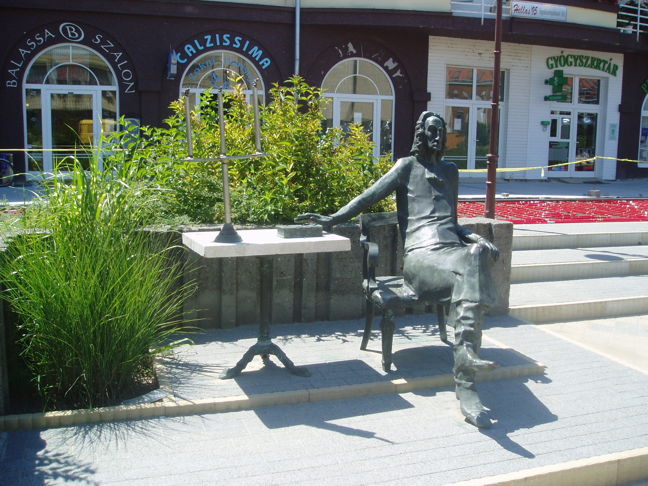 Nyilvános 1494 | 2465 | Siófok, Fő tér: Varga Imre: Professzor | Varga Imre szobrászművész 1923. november 1-jén született Siófokon. Már gyermekkorában - a siófoki elemi iskolában - rendkívül jó rajzkészségével tűnt ki. 13 évesen szerepelt egy képével Párizsban. A képzőművészet terén elért kimagasló érdemeiért, amellyel Magyarország és Siófok város hírnevét is öregbítette, 1985-ben ő lett Siófok város első díszpolgára. Hazai és külföldi tereken, templomokban, középületekben mintegy 300 alkotását helyezték el. Szobrai állnak Belgiumban, Franciaországban, Lengyelországban, Németországban, Norvégiában és Izraelben. Siófokon a Fő téren szabadtéri szoborkiállítása látható. Profeszor című szobra a debreceni Református Kollégium (lásd: Hajdú-Bihar megye: Debrecen, Kálvin tér 16.) legendás tanárának, Hatvani Istvánnak, a "magyar Faust"-nak állít emléket. Eredeti példánya a Nagyerdőben, a Debreceni Egyetem kémiai intézetének közelében látható. A fénykép 2006 júliusában készült. Felh. irod.: http://www.siofok.com/uj/object/varga-hu.html |