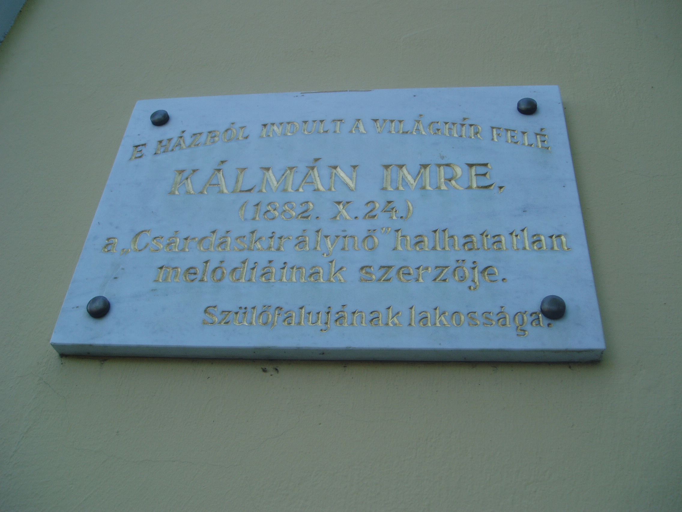 Nyilvános 1477 | 2342 | Siófok, Kálmán Imre sétány 5. | Ebben a vasútállomáshoz közeli házban született 1882-ben a magyar operett egyik legjelentősebb zeneszerzője, Kálmán Imre. Születése napja bizonytalan, még a család sem tudta eldönteni, hogy október 24-én, vagy 25-én jött-e a világra. Édesapja Koppstein Károly Siófokon gabonakereskedő és vállalkozó volt. Édesanyja Singer Paula - szelíd, művészlelkű asszony - megérte fia világhírét. Kálmán Imre a harmadik gyerekként született. Nevét később, a gimnáziumi évek alatt magyarosította Kálmánra. A kis Imre korán tanújelét adta zenei érdeklődésének, tehetségének, amit a családból hozott magával: felmenői között anyai ágon muzsikusok, apai ágon kiváló rabbik, tanítók voltak. Még nem volt hat éves, amikor egy nyáron náluk vett ki szobát Liedl Ferenc hegedűművész, tőle kapott először a kisfiú zenei leckéket. Gyermekként járt először színházban is, a házuk közvetlen szomszédságában egykor állott Nyári Színkörben (lásd: Siófok, Kálmán Imre sétány 6.). Elemi iskolai tanulmányait az egytanerős izraelita népiskolában végezte. Első hivatásos zenetanára még elemista korában a helybeli Remcsák Antal volt. Elemi iskoláinak befejeztével Budapesten tanult tovább a Deák téri Evangélikus Főgimnáziumban. Közben édesapja üzleti vállalkozásai teljesen tönkrementek, mindenüket elárverezték, s a család elhagyta Siófokot. Kálmán Imre a budapesti Zeneakadémián végzett tanulmányai mellett családi követelésre jogot is hallgatott. S bár a Zeneakadémián — ahol évfolyamtársa volt például Bartók Béla — még szimfóniákról álmodott, operettszerzőként lett világhírű. Siófoki szülőházában — amelyet először 1955-ben jelöltek meg emléktáblával — 1970-ben özvegye, Kálmán Vera jelenlétében avattak emlékszobát. A mostani, gazdagabb anyagú emlékmúzeumot a zeneszerző születésének 105. évfordulója alkalmából, 1987. október 22-én nyitották meg. Jelenleg az emlékmúzeum a szülőház földszinti termeiben található, az emeleten kortárs képzőművészeti időszaki kiállításokat szoktak rendezni. A fénykép 2006 júliusában készült. Felh. irod.: Kálmán Imre Múzeum Siófok. Szerk. Koch József. Siófok, 2000 http://www.kalmanimre-muzeum.hu/ |