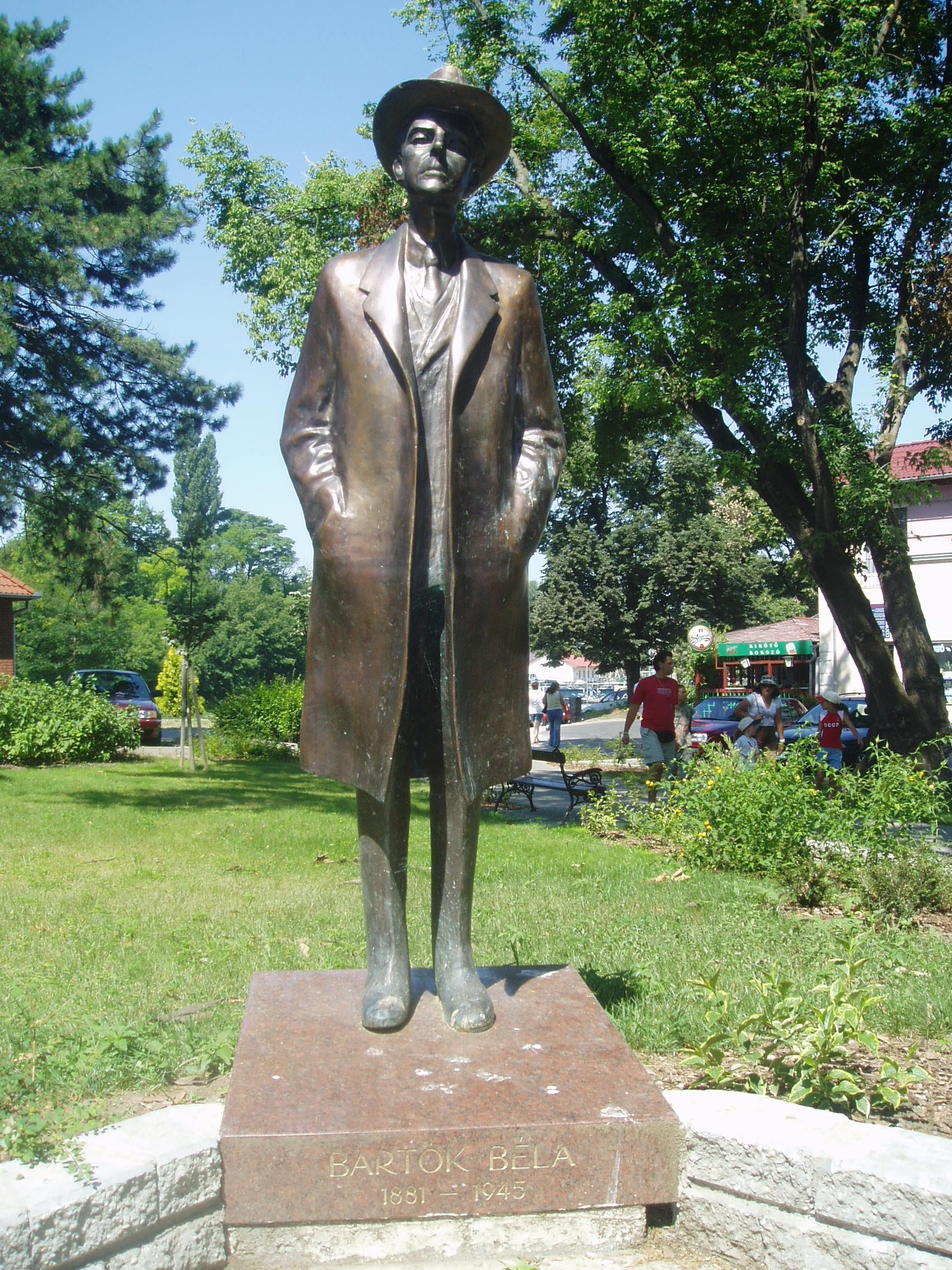 Nyilvános 1454 | 2097 | Siófok, Mártirok útja 5. | A Siófoki Művészeti Iskola (azelőtt Zeneiskola) épülete közelében, a Szent Miklós parkban áll Varga Imre siófoki születésű szobrászművész egészalakos Bartók Béla szobra. A fénykép 2006 júliusában készült. |