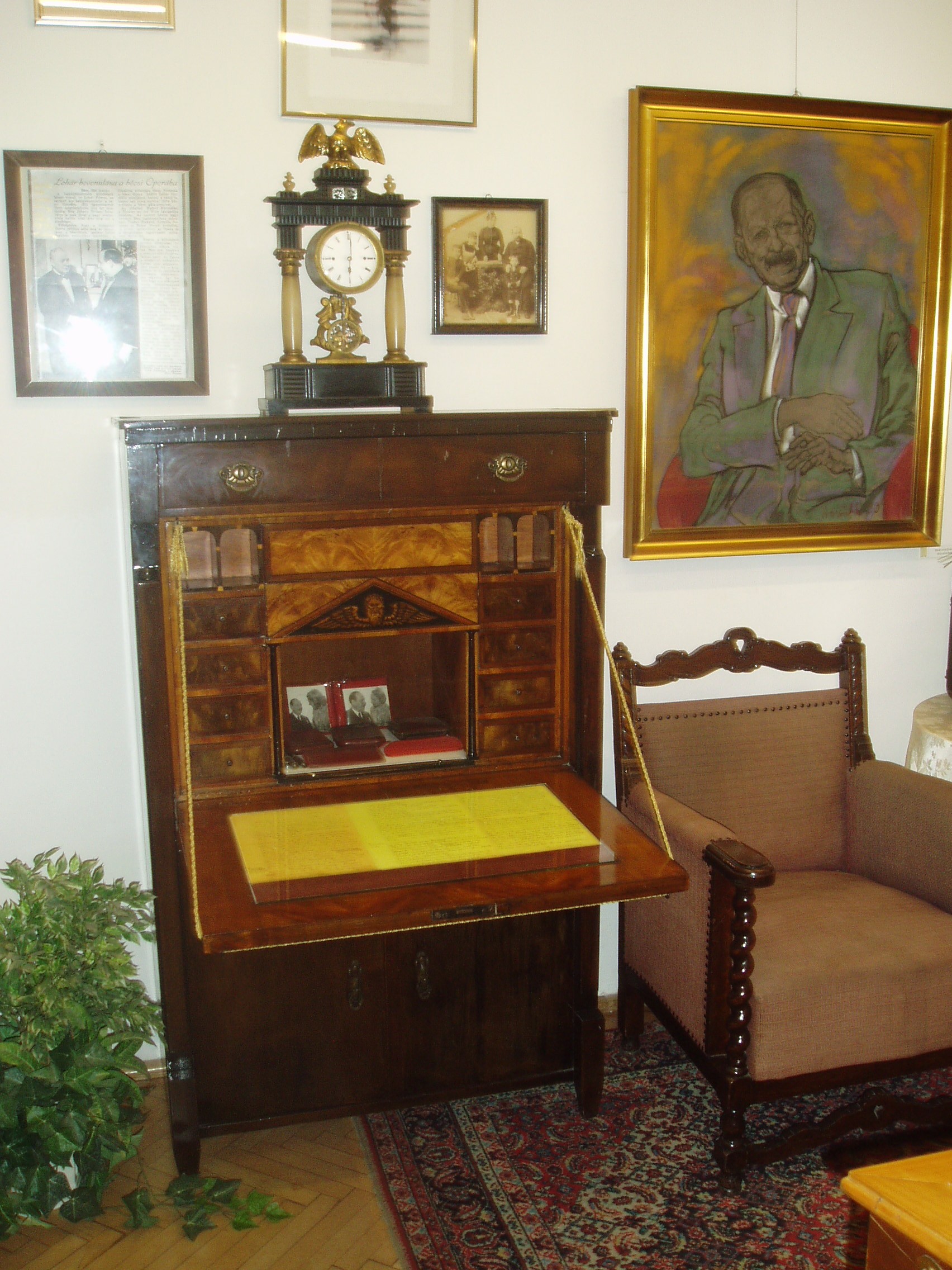 Nyilvános 1528 | 2270 | Siófok, Kálmán Imre sétány 5. | Ebben a vasútállomáshoz közeli házban született 1882-ben a magyar operett egyik legjelentősebb zeneszerzője, Kálmán Imre. Szülőházában — amelyet először 1955-ben jelöltek meg emléktáblával — 1970-ben özvegye, Kálmán Vera jelenlétében emlékszobát avattak. A mostani, gazdagabb anyagú emlékmúzeumot a zeneszerző születésének 105. évfordulója alkalmából, 1987. október 22-én nyitották meg. Jelenleg az emlékmúzeum a szülőház földszinti termeiben található, az emeleten kortárs képzőművészeti időszaki kiállításokat szoktak rendezni. Kálmán Imre számos személyes tárgyát állították itt ki enteriőr-szerűen. A tárgyak között látható látható Kálmán Imre kedves karosszéke és szekretere, amelyen sok gyönyörű dallamot vetett papírra. A fénykép 2006 júliusában készült. Felh. irod.: Kálmán Imre Múzeum Siófok. Szerk. Koch József. Siófok, 2000 http://www.kalmanimre-muzeum.hu/ |