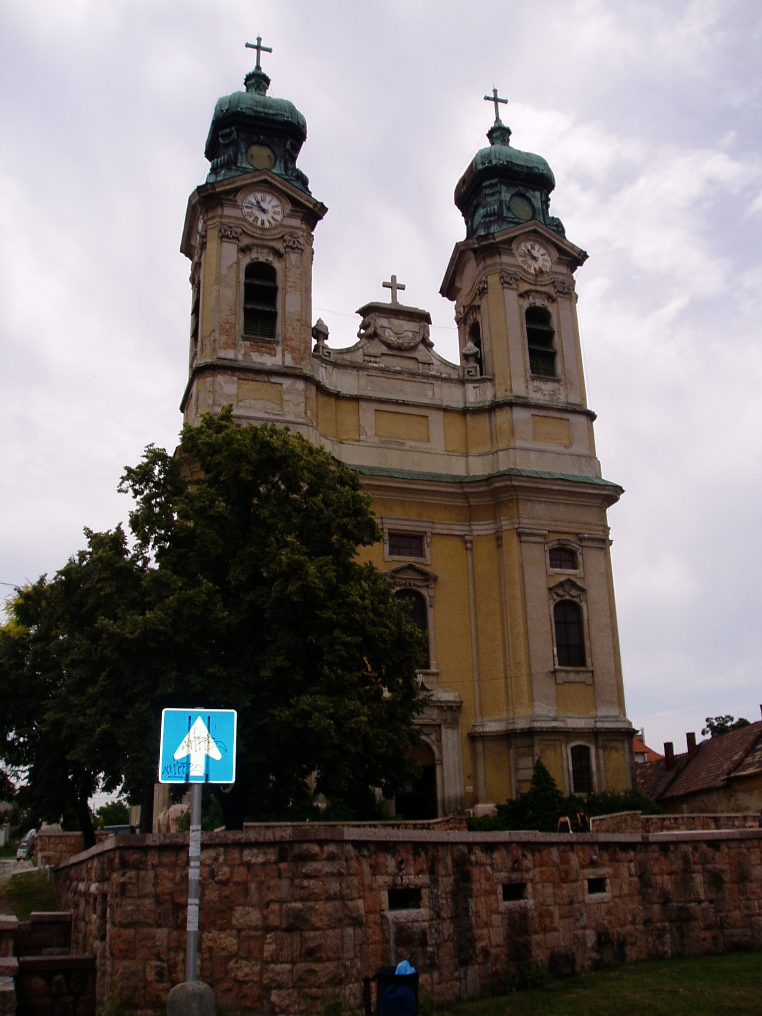 Nyilvános 1849 | 3612 | Tata, Kossuth tér: Római katolikus templom | A kéttornyú, copfstílusú templom Franz Anton Pilgram és Fellner Jakab tervei szerint épült 1751-1787 között. Az egyhajós templom külső és belső díszítésében a levelekből font füzérdísz uralkodik. A főhajónál szűkebb terű szentély főoltár oszlopos építményében a Kálvária faragott korpusza látható - Schweiger Antal műve. Értékes munka a márvány szentélyrács, a gazdag faragványú szószék, valamint a Péter és Pál apostol búcsúját ábrázoló Hubert Mauer-festmény. A gyóntatószékek és padok copfstílusúak. A sekrestye értékes rokokó berendezése a majki kamalduli remeteségből került ide. A templom kriptájában temették el Károly Ambrus hercegprímást, Eszterházy Ferenc grófot és a tervező Fellner Jakabot. Felh. irod.: Látnivalók Komárom-Esztergom megyében. Miskolc, Well-PRess, 2003 |