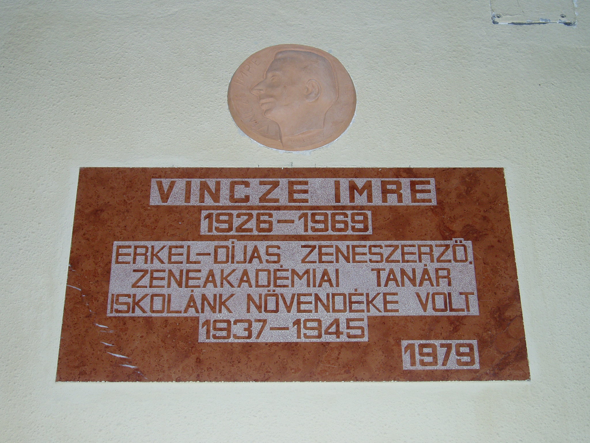 Nyilvános 1873 | 3546 | Tata, Tanoda tér 5. Eötvös József Gimnázium: Vincze Imre emléktáblája | A tatai gimnáziumot 1765-ben gróf Esterházy Miklós alapította, s vezetésére a piarista tanítórendet kérte fel. Az iskola kezdetben a közeli majki kamalduli szerzetesek többször is átalakított gazdasági épületeiben működött. A jelenlegi iskolaépületet a XX. század elején emelték, 1912-ben kezdődött meg benne a tanítás. Az első emeleti folyosó falán neves egykori tanárok és diákok emléktábláit helyezték el. Vincze Imre (1926-1969) zeneszerző 1937-1945 között volt az iskola diákja. A fénykép 2005. júliusában készült. Felh. irod.: www.eotvos-tata.sulinet.hu Wehner Tibor: Tatai szobrok, emlékművek, emléktáblák. Tata, 1980 |