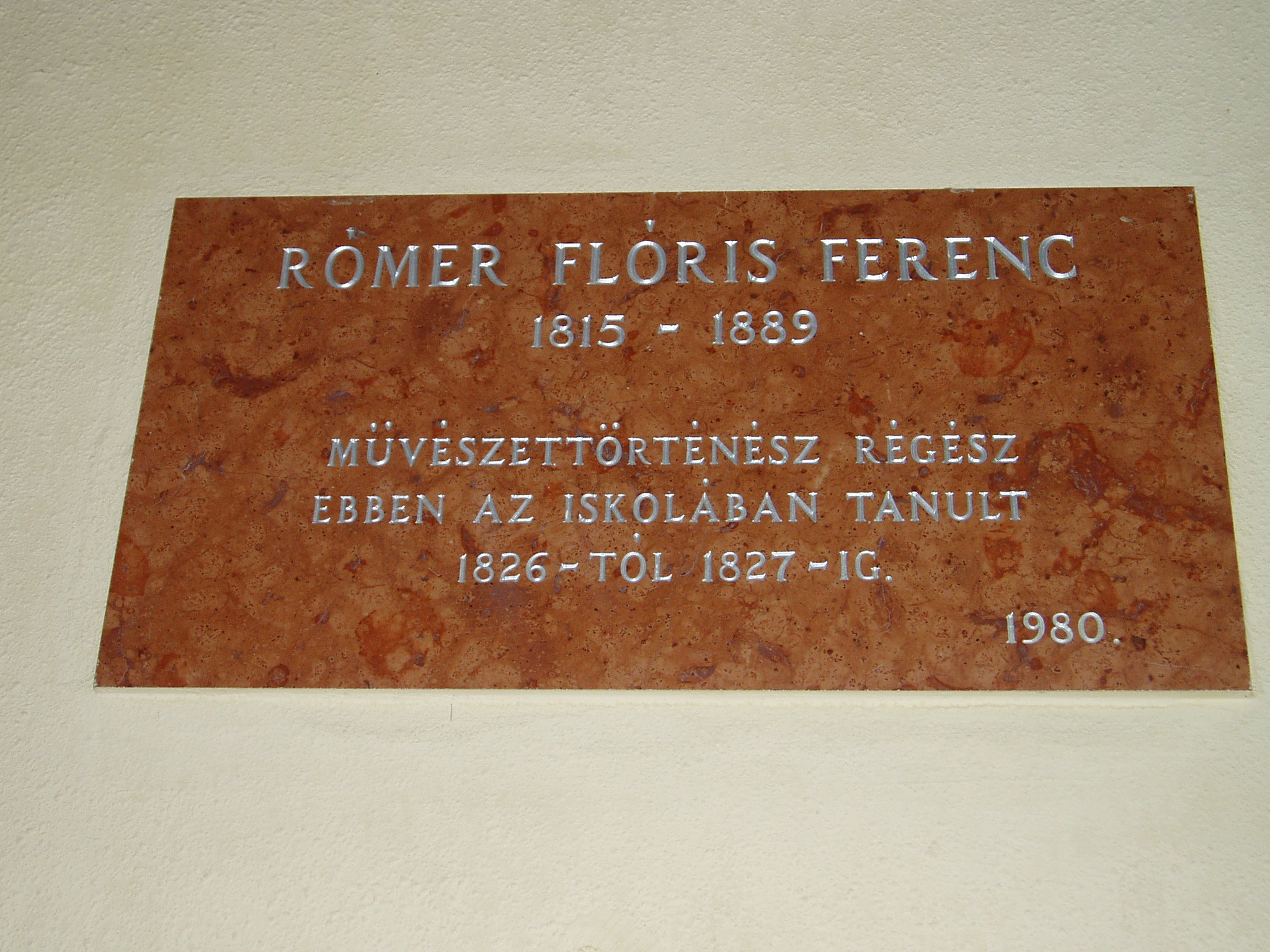 Nyilvános 1771 | 3611 | Tata, Tanoda tér 5. Eötvös József Gimnázium: Rómer Flóris emléktáblája | A tatai gimnáziumot 1765-ben gróf Esterházy Miklós alapította, s vezetésére a piarista tanítórendet kérte fel. Az iskola kezdetben a közeli majki kamalduli szerzetesek többször is átalakított gazdasági épületeiben működött. A jelenlegi iskolaépületet a XX. század elején emelték, 1912-ben kezdődött meg benne a tanítás. Az első emeleti folyosó falán neves egykori tanárok és diákok emléktábláit helyezték el. 11826-1827-ben a tatai gimnázium tanulója volt Rómer Flóris (1815-1889) régész, művészettörténész, egyetemi tanár, akadémikus, a magyar régészettudomány, művészettörténet és műemlékvédelem egyik megteremtője. 1830-ban lett bencés szerzetes. Váradi püspökként halt meg 1889-ben, sírja a nagyváradi székesegyház kriptájában van. A fénykép 2005. júliusában készült. Felh. irod.: www.eotvos-tata.sulinet.hu Wehner Tibor: Tatai szobrok, emlékművek, emléktáblák. Tata, 1980 Száztizenöt éve hunyt el Rómer Flóris. = www. mult-kor.hu 2004. márc. 18. |