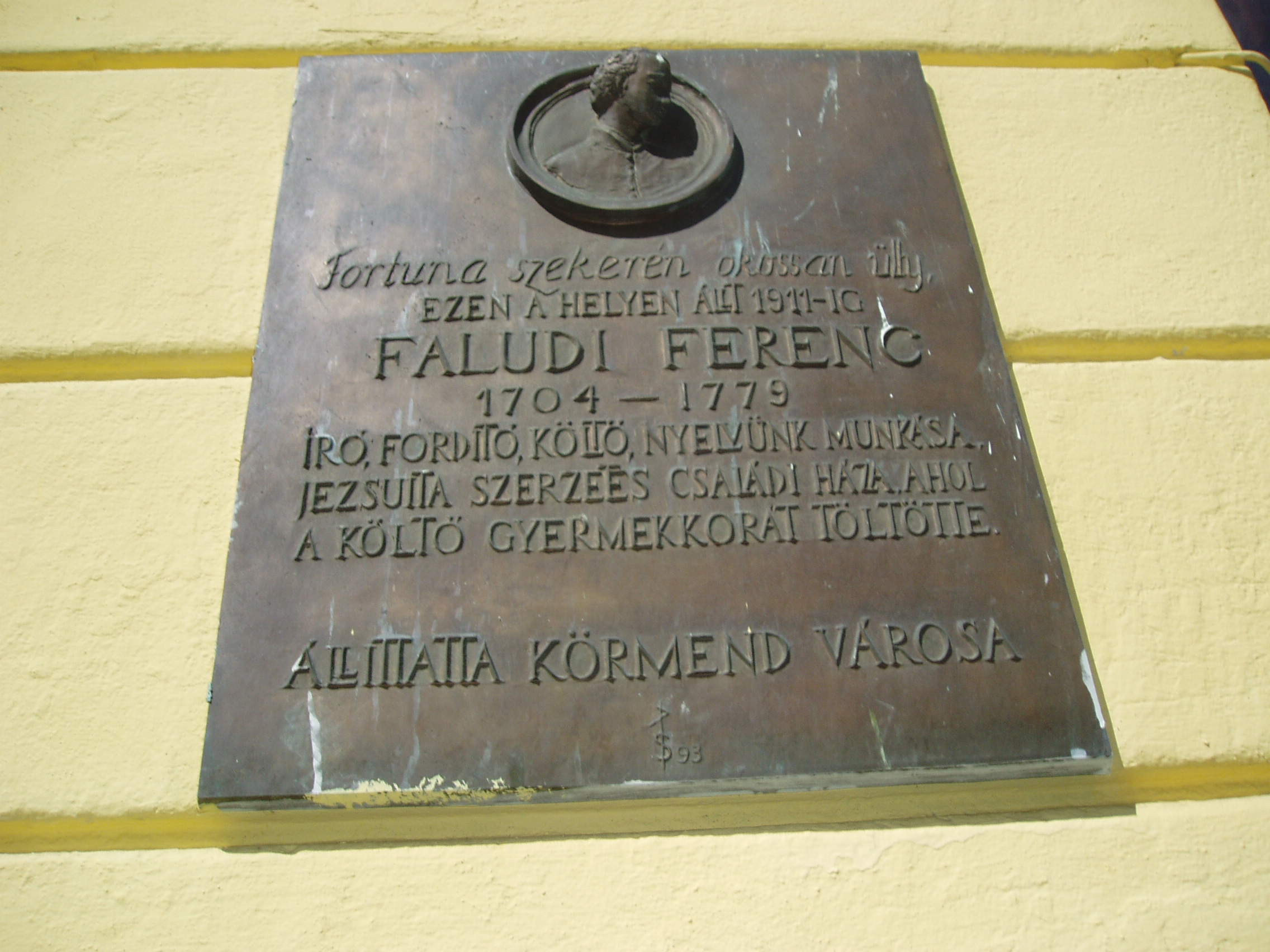 Nyilvános 1568 | 2569 | Körmend, Szabadság tér 5. | Mint a városközpontban lévő épület homlokzatán elhelyezett emléktáblán is olvasható, ezen a helyen állott egykor az a ház, amelyben Faludi Ferenc (1704-1779) költő a gyermekkorát töltötte. Apja a Batthyány grófok tiszttartója volt; az ingatag politikai helyzetben, a kuruc-labanc harcok közepette várandós feleségét Németújvárra vitte, s ott született meg fiuk. A harcok elcsitulásával a család visszatért Körmendre. Itt cseperedett fel a későbbi jezsuita szerzetes, író-költő és műfordító. 1720-ban lépett be a jezsuita rendbe. A bécsi Pázmáneumon és Egyetemen kívül Grazban és Linzben tanárkodott. 1773-ban a rend eltörlése Pozsonyban érte, ekkor Rohoncra költözött az alapítványi házba. Ott élt csendes visszavonultságban, de szorgalmasan dolgozva 1779. december 18-án bekövetkezett haláláig. A fénykép 2006 májusában készült. Felh. irod.: Pintér Pál: Séta Körmenden. Körmend, Csaba József Honismereti Egyesület, 2002 |
