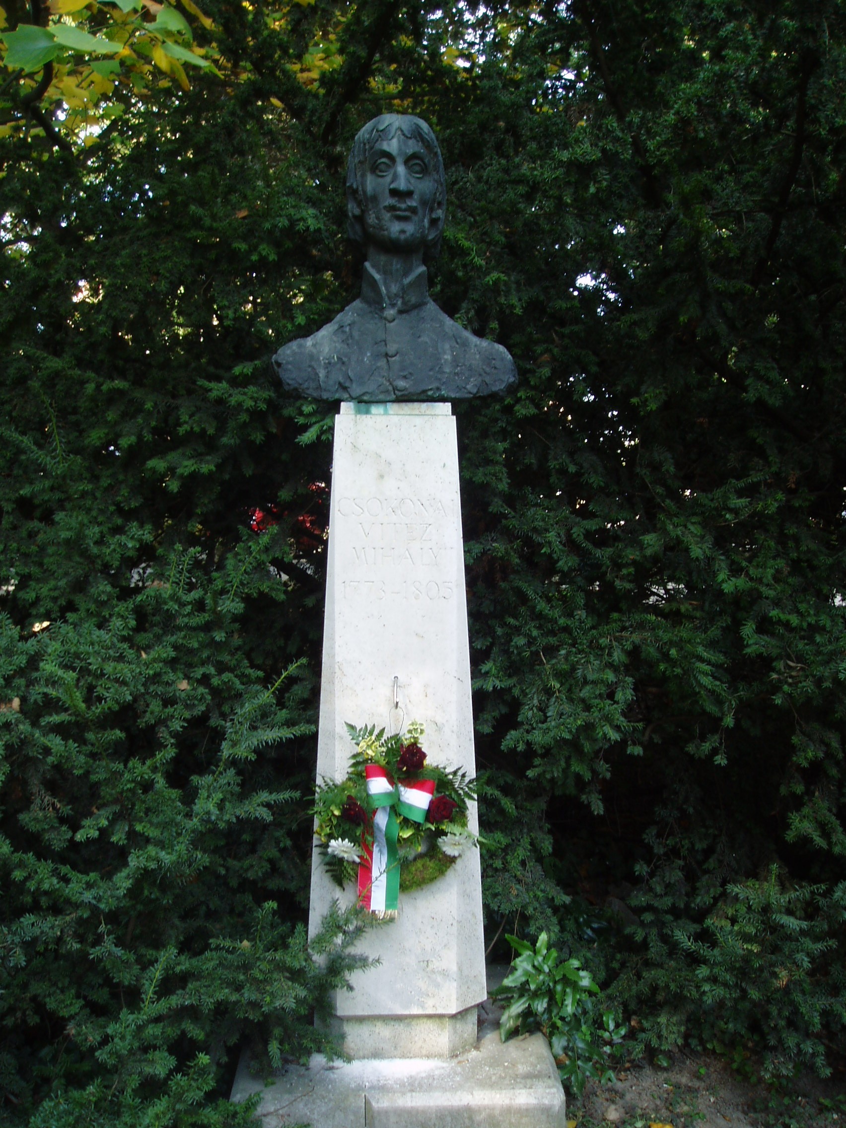 Nyilvános 1626 | 3066 | Hévíz, Schulhof sétány: Csokonai Vitéz Mihály szobra | A Schulhof sétányon a szanatórium felé haladva jobbra egy szoborparkot találunk. Irodalmunk nagyjainak szoborportréi között ott van Csokonai Vitéz Mihályé is. A mellszobor Rátonyi József alkotása. Csokonai annakidején a közeli Keszthelyen járt (lásd: Keszthely, Kastély u. 11.), mecénása volt Festetics György. 1985-ben Major Zala Lajos költő (lásd még: Hévíz, Hunyadi út 9.) és köre Hévízen alapította meg a Csokonai Irodalmi Társaságot, amely az utóbbi években minden ősszel megrendezi a költői versennyel egybekötött Csokonai Napokat. A felvétel 2006 októberében készült. Felh. irod.: Látnivalók Zala megyében. Miskolc, Well PRess, 1998 www.csokonai.org |