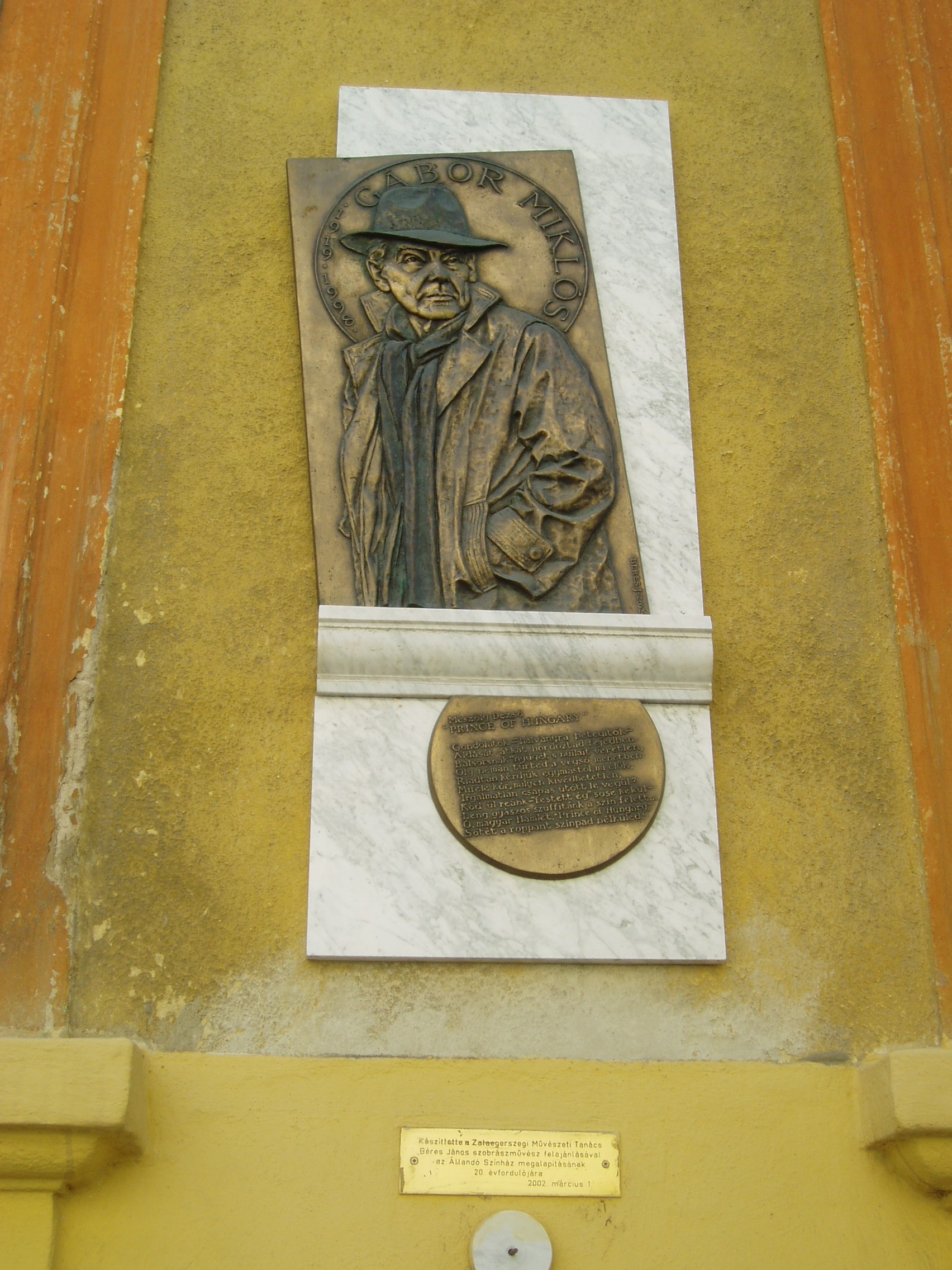Nyilvános 1635 | 3198 | Zalaegerszeg, Ady utca 9. | Ebben a házban született 1919. április 7-én Gábor Miklós (1919-1998) színművész, rendező, író. Apja, Gábor Béla mozit üzemeltetett a városban Edison Filmszínház néven (az Arany Bárány szálloda háta mögötti épület 1945 után leégett). 1926-ban a család Székesfehérvárra költözött. Az ország egyik legnagyobb színészeként számon tartott művész 1983-ban visszatért szülővárosába: Ruszt József rendezésében az újonnan alapított zalaegerszegi színház állandó épületének megnyitó előadásán Lucifer szerepét játszotta Madách Imre: Az ember tragédiája című művében. A művész 1982-84 között a színház művészeti tanácsadója is volt. A szülőházán elhelyezett emléktábla domborműve legendássá vált modern, puhakalapos Luciferként örökítette meg. A felvétel 2006 júniusában készült. Felh. irod.: Zalai életrajzi lexikon. = http://zalai.dfmk.hu/zalaiak |