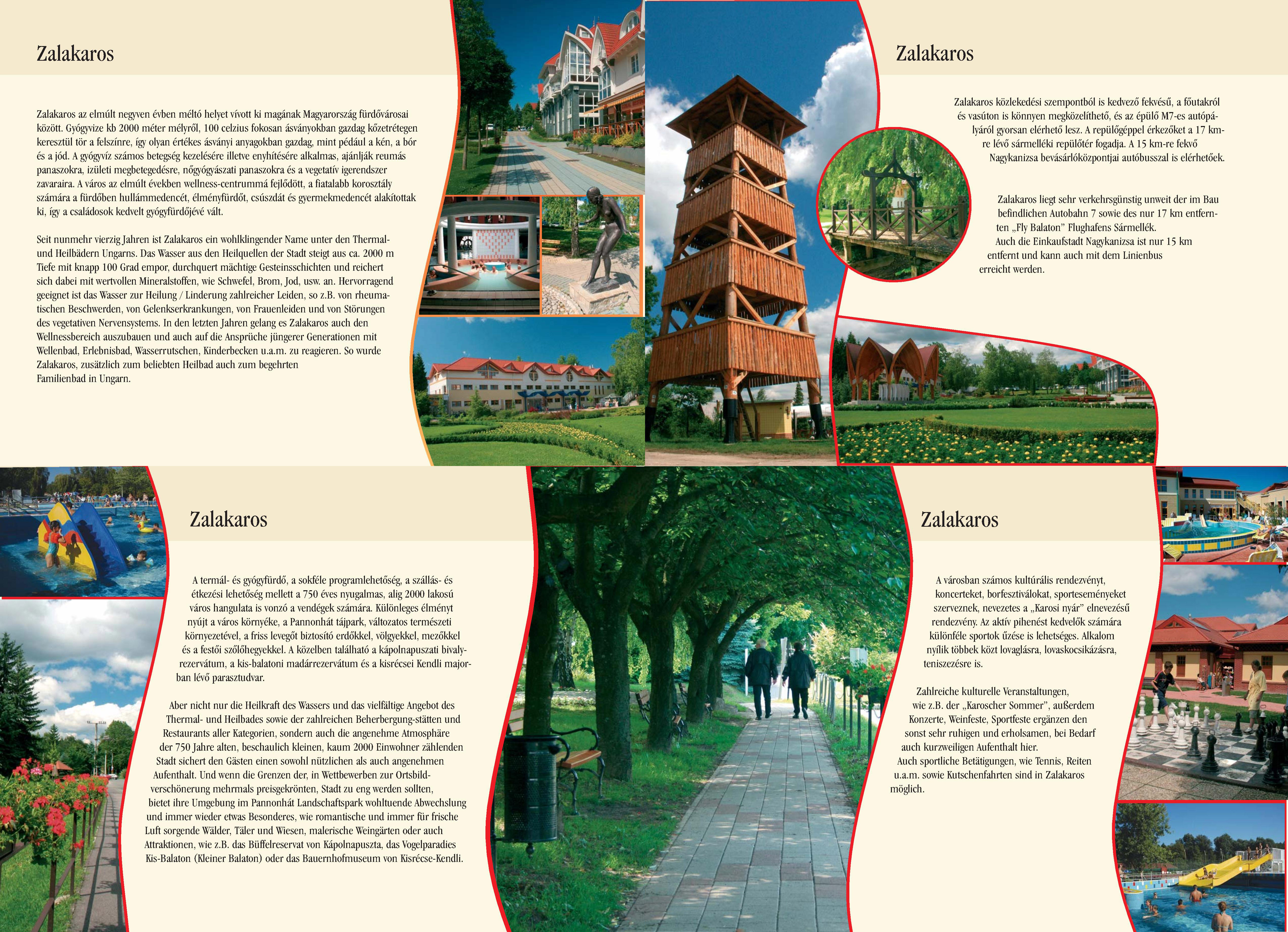 Nyilvános 2350 | 6366 | Zalakaros | Seit nunmehr vierzig Jahren ist Zalakaros ein wohlklingender Name unter den Thermal- und Heilbädern Ungarns. Das Wasser aus den Heilquellen der Stadt steigt aus ca. 2000 m Tiefe mit knapp 100 Grad empor, durchquert mächtige Gesteinsschichten und reichert sich dabei mit wertvollen Mineralstoffen, wie Schwefel, Brom, Jod, usw. an. Hervorragend geeignet ist das Wasser zur Heilung / Linderung zahlreicher Leiden, so z.B. von rheumatischen Beschwerden, von Gelenkserkrankungen, von Frauenleiden und von Störungen des vegetativen Nervensystems. In den letzten Jahren gelang es Zalakaros auch den Wellnessbereich auszubauen und auch auf die Ansprüche jüngerer Generationen mit Wellenbad, Erlebnisbad, Wasserrutschen, Kinderbecken u.a.m. zu reagieren. So wurde Zalakaros, zusätzlich zum beliebten Heilbad auch zum begehrten Familienbad in Ungarn. Aber nicht nur die Heilkraft des Wassers und das vielfältige Angebot des Thermal- und Heilbades sowie der zahlreichen Beherbergung-stätten und Restaurants aller Kategorien, sondern auch die angenehme Atmosphäre der 750 Jahre alten, beschaulich kleinen, kaum 2000 Einwohner zählenden Stadt sichert den Gästen einen sowohl nützlichen als auch angenehmen Aufenthalt. Und wenn die Grenzen der, in Wettbewerben zur Ortsbild-verschönerung mehrmals preisgekrönten, Stadt zu eng werden sollten, bietet ihre Umgebung im Pannonhát Landschaftspark wohltuende Abwechslung und immer wieder etwas Besonderes, wie romantische und immer für frische Luft sorgende Wälder, Täler und Wiesen, malerische Weingärten oder auch Attraktionen, wie z.B. das Büffelreservat von Kápolnapuszta, das Vogelparadies Kis-Balaton (Kleiner Balaton) oder das Bauernhofmuseum von Kisrécse-Kendli. Zahlreiche kulturelle Veranstaltungen, wie z.B. der ,,Karoscher Sommer", außerdem Konzerte, Weinfeste, Sportfeste ergänzen den sonst sehr ruhigen und erholsamen, bei Bedarf auch kurzweiligen Aufenthalt hier. Auch sportliche Betätigungen, wie Tennis, Reiten u.a.m. sowie Kutschenfahrten sind in Zalakaros möglich. Zalakaros liegt sehr verkehrsgünstig unweit der im Bau befindlichen Autobahn 7 sowie des nur 17 km entfernten ,,Fly Balaton" Flughafens Sármellék. Auch die Einkaufstadt Nagykanizsa ist nur 15 km entfernt und kann auch mit dem Linienbus erreicht werden. Dieses Text stammt von: Pannonhát tájpark prospektus 2006. Web: http://www.pannonhat.hu/ (auch in Deutsch) |