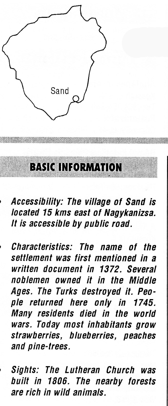 Nyilvános 2851 | 8460 | Rövid leírás | Teljes leírás (1020 B) | Sand BASIC INFORMATION Accessibility: The village of Sand is located 15 kms east of Nagykanizsa. It is accessible by public road. Characteristics: The name of the settlement was first mentioned in a written document in 1372. Several noblemen owned it in the Middle Ages. The Turks destroyed it. People returned here only in 1745. Many residents died in the world wars. Today most inhabitants grow strawberries, blueberries, peaches and pine-trees. Sights: The Lutheran Church was built in 1806. The nearby forests are rich in wild animals. This text came from the following book: Title: Handbook of Zala county (Zala megye kézikönyve) Series: County handbooks of Hungary (Magyarország megyei kézikönyvei) Chief editor: Hóbor József Publisher: (Hatvan), CEBA-Hungary Ltd, 1998 ETO: 908.439.121(035) ; 050.8(439.121) ISBN: 963-9089-18-2 Pages: 488-1040 p. Remark: Closed on: 1998. márc. 31. |
