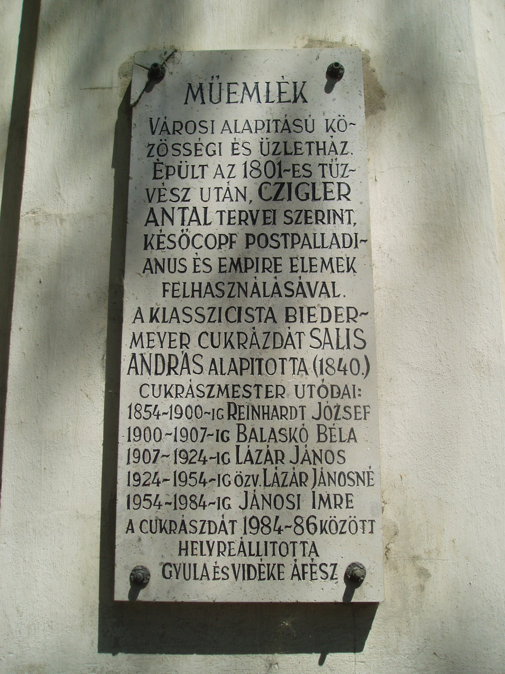 Nyilvános 1775 | 3368 | Gyula, Erkel tér 1. Százéves cukrászda | 1801-ben, a nagy tűzvész után épült az egyemeletes, L alakú, műemlékké nyilvánított ház. Erkel térre néző oldala copf- és empire stílusú, a Jókai utca felőli részen klasszicista elemek is felfedezhetők. Műemléki megítélés szerint "korát és színvonalát tekintve a Dél-Alföld legértékesebb emeletes polgárháza". Földszintjén található a megye legrégibb, s az ország egyik legnevezetesebb műemléki cukrászdája, mely bizonyíthatóan legalább 1840 óta fennáll. XIX. századi tulajdonosáról eredetileg Reinhardt-cukrászdának nevezték. A cukrászda elkerülte az államosítást, megőrizték régi berendezését, s a helyiségek reformkori hangulatát. Az udvar felőli folyosón az egykori szabadkéményes cukrászműhely felszereléseit, eszközeit bemutató kiállítás látható. A fénykép 2007 júliusában készült. Felh. irod.: Czeglédi Imre: Gyula útikalauz. 2. bőv. kiad. Gyula, 1995 |