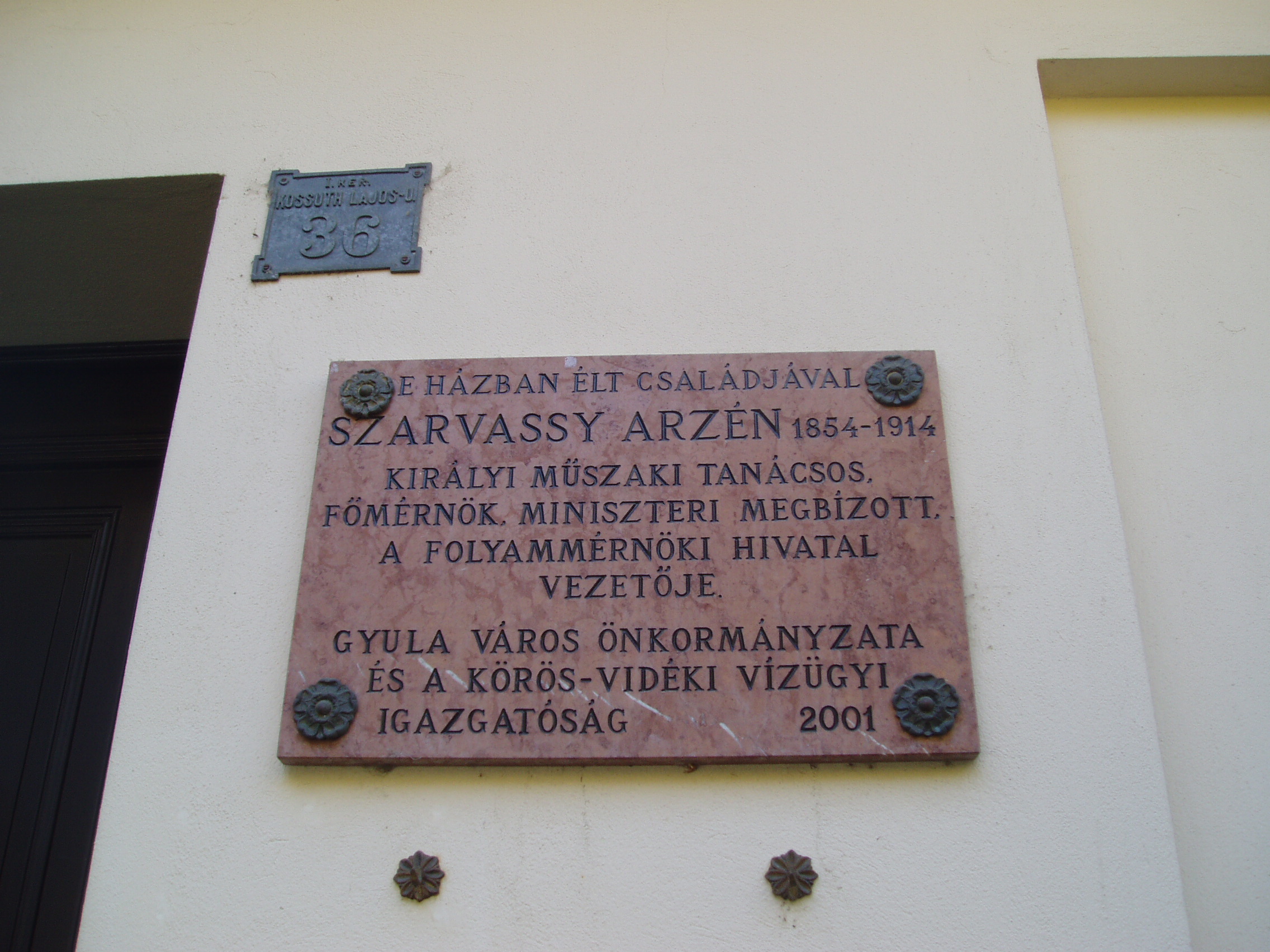 Nyilvános 946 | 1475 | Gyula, Kossuth utca 36. | Az épületben az uradalmi kulcsár lakott, majd a szabadságharc bukása után itt helyezték el az új szervezésű csendőrséget. 1853-ban itt tartották őrizetben Pfiffner Paulinát (1825-1853), egy mezőhegyesi méneskari tiszt leányát, aki férfiruhában mint honvéd hadnagy végigharcolta a szabadságharcot. A "Hős honvédleány" egy óvatlan pillanatban ebben a házban lett öngyilkos: szeptember 1-jén fegyverhez jutott és meglőtte magát. Hetekkel később, szeptember 29-én hunyt el a gyulai kórházban. Testét az egyházi tilalom miatt a temető árkában földelték el, csak 1888-ban kapott méltó síremléket közadakozásból. A házon emléktábla idézi Szarvassy Arzén (1854-1914) alakját. A királyi műszaki tanácsos, a Folyammérnöki Hivatal vezetője ebben a házban élt családjával. A fénykép 2007 júliusában készült. Felh. irod.: Czeglédi Imre: Gyula útikalauz. 2. jav., bőv. kiad. Gyula, 1995 www.bekes-archiv.hu/dokumentumok/olvasokonyv |