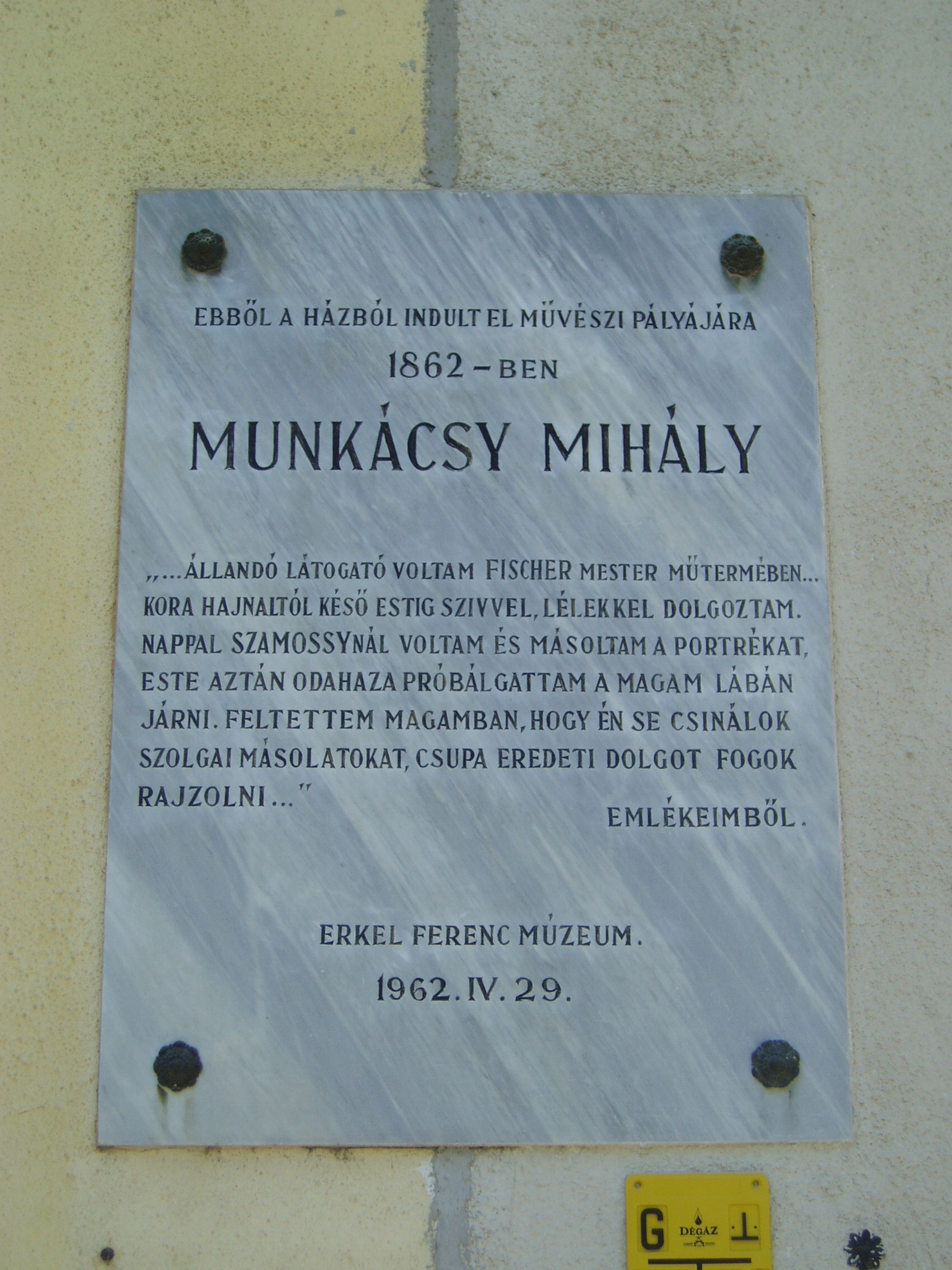 Nyilvános 942 | 1440 | Gyula, Munkácsy utca 15. | Ebben a földszintes házban - Oláh György asztalosmester egykori házában - lakott 1860-61-ben Reök István, Munkácsy Mihály nagybátyja és gyámja. A Bach-rendszer bukása után ugyanis mint régi negyvennyolcas a megyénél kapott állást, s Gyulára költözött (korábban Békéscsabán élt). Az Aradon asztaloslegényként dolgozó gyámfia, akkor még Lieb Mihály 1860 őszén őhozzá jött haza Gyulára. A sokáig váltólázban szenvedő fiút nagybátyja Karl Fischer helybeli rajztanár műtermében taníttatta, hogy az asztalosmesterséghez szükséges rajztudást elsajátítsa. S itt, Fischer mesternél látta meg őt a Wenckheim kastélyban (lásd: Gyula, Kossuth u. 15.) tartózkodó Szamossy Elek festőművész, aki felismerte Munkácsy tehetségét, magához vette, s Gyuláról távozván, a nagybácsi engedélyével magával is vitte. Így mentette meg a tehetséges fiút a magyar művészet számára. Munkácsy maga is azt vallja önéletírásában, hogy élete sorsa Gyulán dőlt el. A ház falán márványtábla őrzi Munkácsy emlékét, s ezen idézetet olvashatunk Munkácsy "Emlékeimből" című önéletrajzából. A fénykép 2007 júliusában készült. Felh. irod.: Czeglédi Imre: Gyula útikalauz. 2. jav., bőv. kiad. Gyula, 1995 |