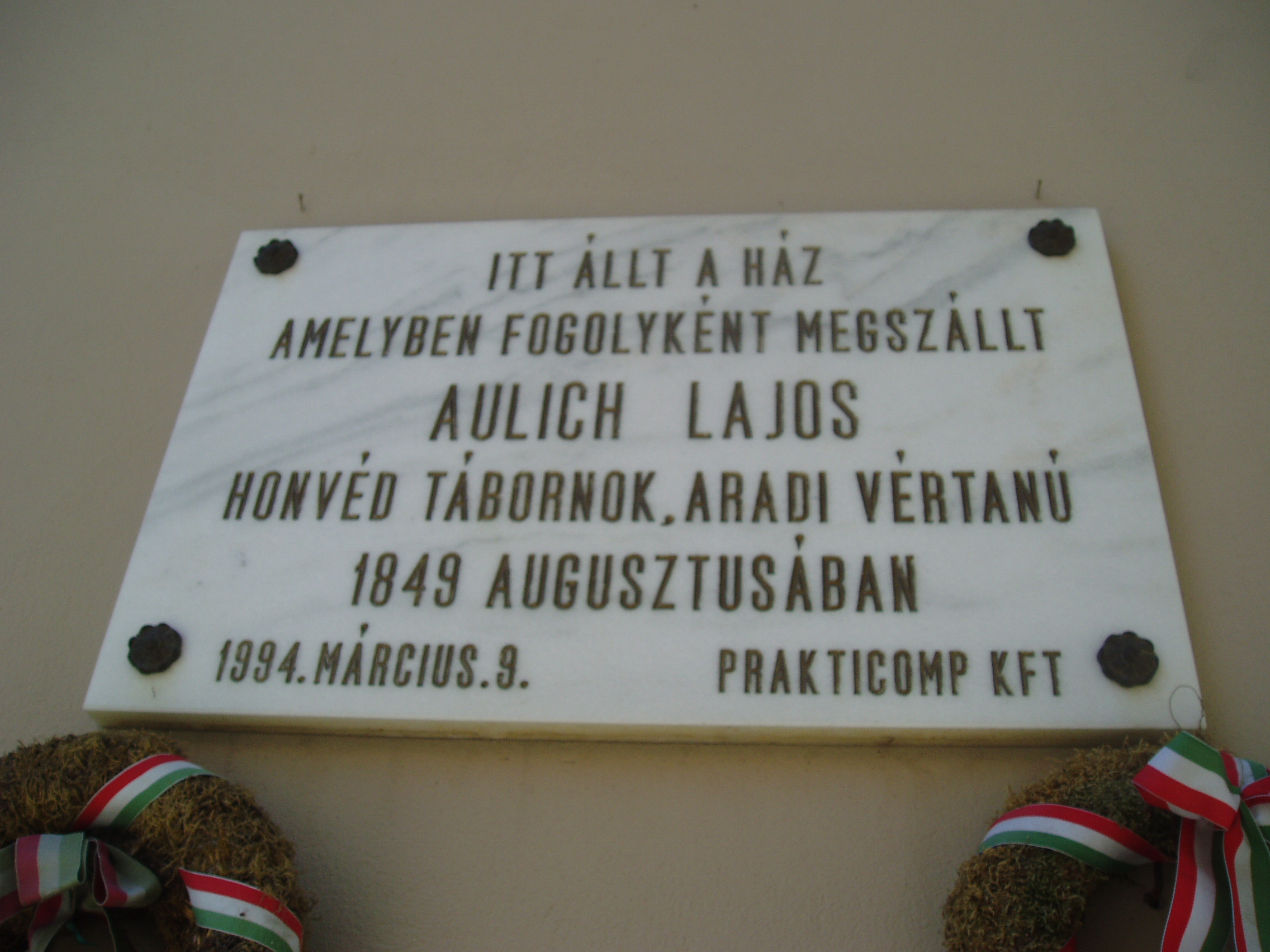 Nyilvános 1324 | 1758 | Gyula, Városház utca 23. | A lakóházat 1994-ben eredeti formájában építették újjá. 1849 augusztusában itt szállt meg Aulich Lajos honvéd tábornok. A szabadságharc tragikus gyulai eseményét lásd: Gyula, Várkert: Honvédtiszti emlékhely. A fénykép 2007 júliusában készült. Felh. irod.: Czeglédi Imre: Gyula útikalauz. 2. jav., bőv. kiad. Gyula, 1995 |
