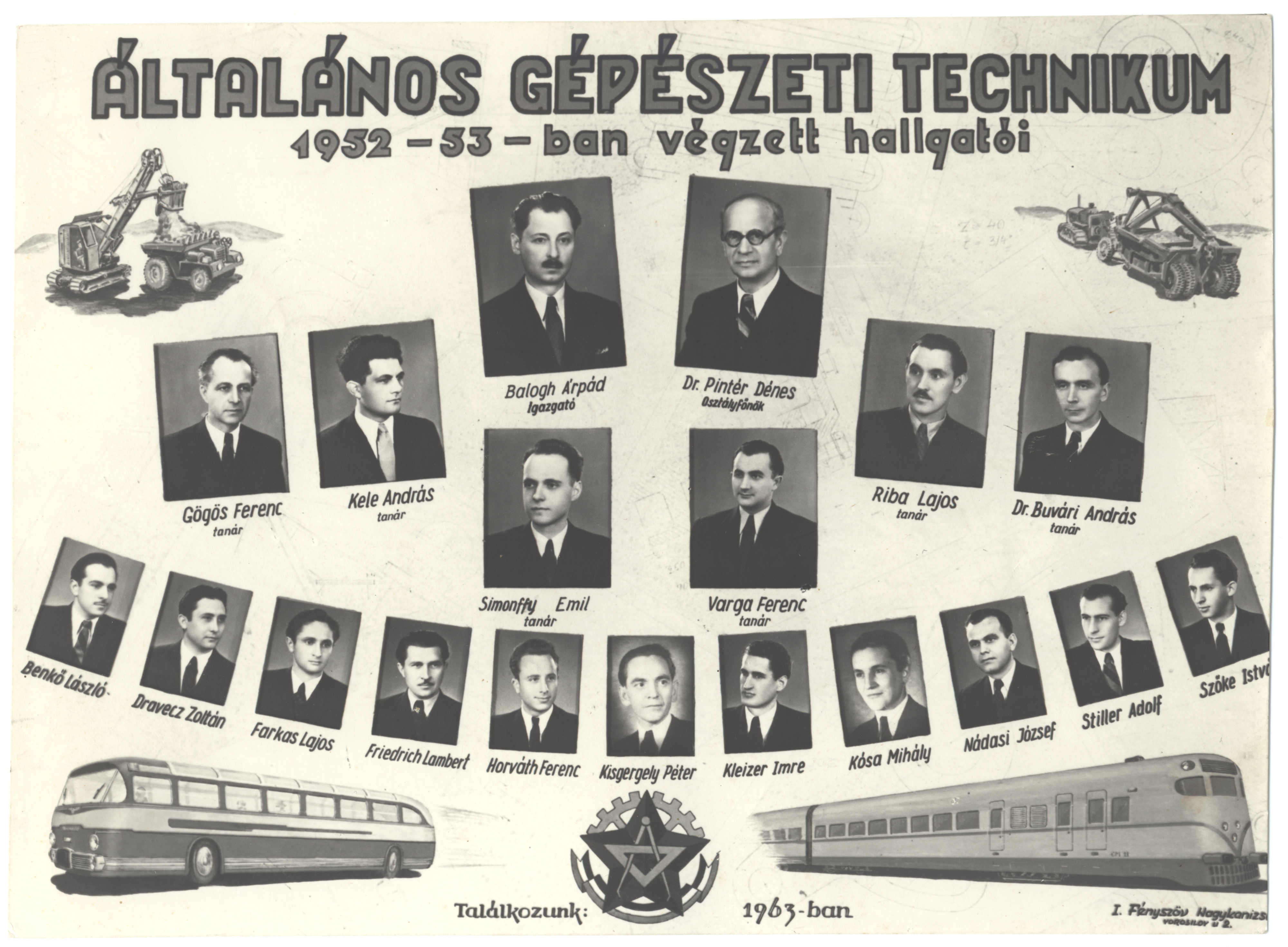 Nyilvános 1807 | 3339 | Általános Gépészeti Technikum 1952-53-ban végzett hallgatói | Balogh Árpád igazgató Buvári András dr. tanár Gögös Ferenc tanár Kele András tanár Pintér Dénes dr. osztályfőnök Riba Lajos tanár Simonffy Emil tanár Varga Ferenc tanár Benkő László Dravecz Zoltán Farkas Lajos Friedrich Lambert Horváth Ferenc Kisgergely Péter Kleizer Imre Kósa Mihály Nádasi József Stiller Adolf Szőke István |