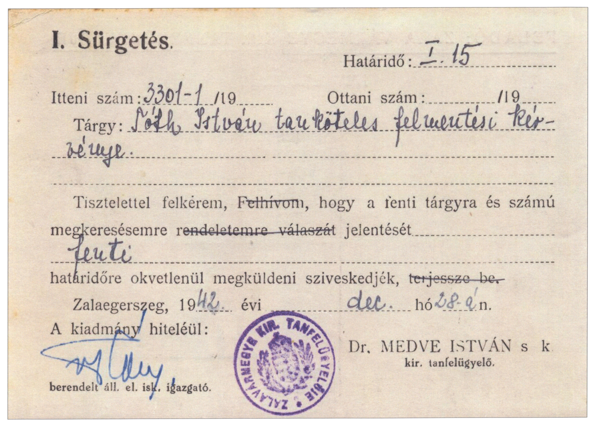 Sürgetés. Tárgy: Tóth István tanköteles felmentési kérvénye