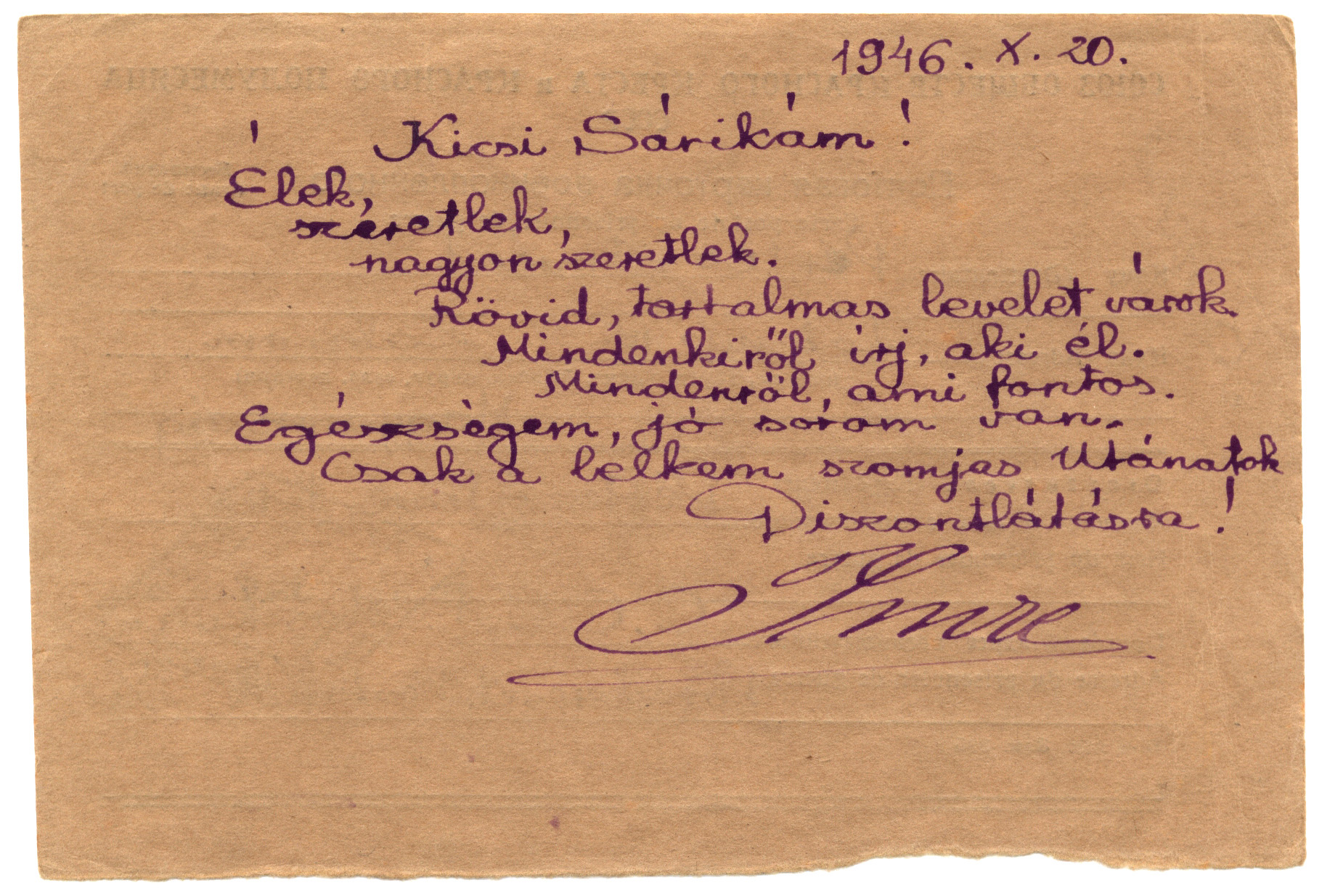 Nyilvános 1660 | 2741 | Vértes Imréné | Letenye IV. Zala vm. Magyarország Vértes Imre hdgy. C.C.C.P. Moszkva Vöröskereszt, Postafiók 430/1. c. 1946.X.20. Kicsi Sárikám! Élek, szeretlek, nagyon szeretlek. Rövid, tartalmas levelet várok. Mindenkiről írj, aki él. Mindenről, ami fontos. Egészségem, jó sorom van. Csak a lelkem szomjas utánatok. Viszontlátásra! Imre |