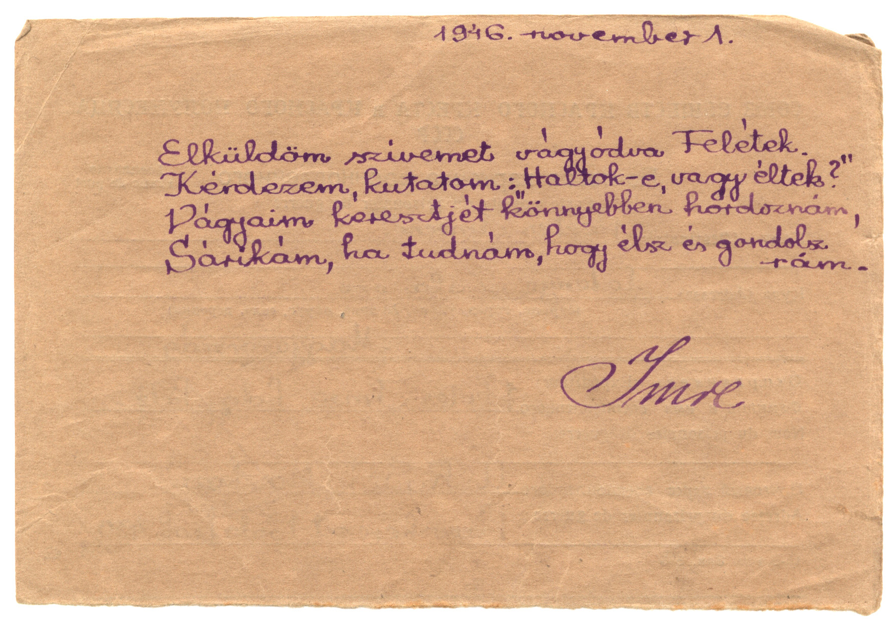 Nyilvános 1716 | 2805 | Vértes Imréné | Letenye Zala vm. Magyarország Vértes Imre hdgy. hdf. C.C.C.P. "Moszkva" Vöröskereszt, Postafiók 430/1. c. 1946. november 1. Elküldöm szívemet vágyódva Felétek. Kérdezem, kutatom: "Haltok-e, vagy éltek?" Vágyaim keresztjét könnyebben hordoznám, Sárikám, ha tudnám, hogy élsz és gondolsz rám. Imre |