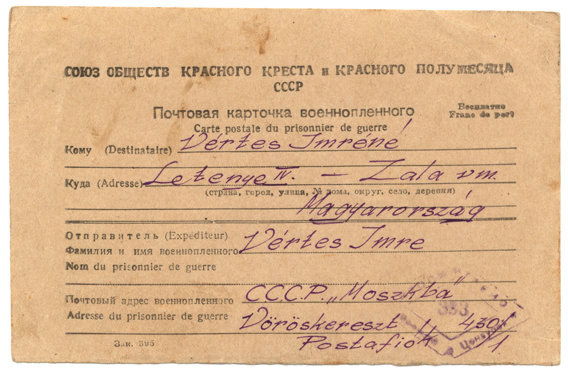 Nyilvános 1633 | 2534 | Vértes Imréné | Letenye IV. - Zala vm. Magyarország Vértes Imre hdgy. C.C.C.P. "Moszkva" Vöröskereszt, Postafiók 430/1. c. 10. IV. hó 1947. (Kaptam V. 12-én) Kedveseim! Húsvét volt, ünnep. Hogy gondoltam Rátok? Így! Volt nékem kis váram, mesekinccsel ékes, Szerelemmel, szívvel, széppel, jóval fényes. Aranyasszony ajka, gyermekkacaj hangja Csilingelt a szívben boldogság harangja. Mit éreztem? Amit Te szoktál érezni-, Sárikám - mikor a négy alvó kisgyerek fölött imát dalol a szíved. Nagy, tiszta, szép vágyat! A szép élet utáni vágyat. Apuka |