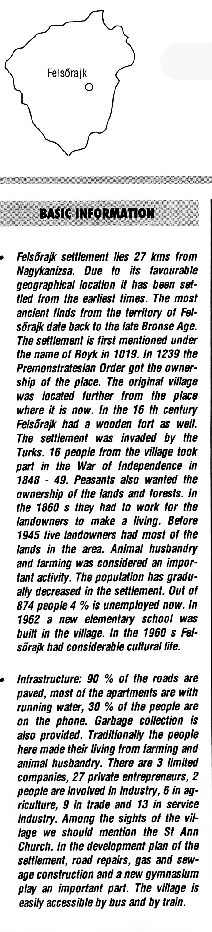 Nyilvános 2627 | 7347 | Rövid leírás | Teljes leírás (2.2 KB) | Felsőrajk BASIC INFORMATION • Felsőrajk settlement lies 27 kms from Nagykanizsa. Due to its favourable geographical location it has been settled from the earliest times. The most ancient finds from the territory of Felsőrajk date back to the late Bronse Age. The settlement is first mentioned under the name of Royk in 1019. In 1239 the Premonstratesian Order got the ownership of the place. The original village was located further from the place where it is now. In the 16 th century Felsőrajk had a wooden fort as well. The settlement was invaded by the Turks. 16 people from the village took part in the War of Independence in 1848 - 49. Peasants also wanted the ownership of the lands and forests. In the 1860 s they had to work for the landowners to make a living. Before 1945 five landowners had most of the lands in the area. Animal husbandry and farming was considered an important activity. The population has gradually decreased in the settlement. Out of 874 people 4% is unemployed now. In 1962 a new elementary school was built in the village. In the 1960 s Felsőrajk had considerable cultural life. • Infrastructure: 90 % of the roads are paved, most of the apartments are with running water, 30 % of the people are on the phone. Garbage collection is also provided. Traditionally the people here made their living from farming and animal husbandry. There are 3 limited companies, 27 private entrepreneurs, 2 people are involved in industry, 6 in agriculture, 9 in trade and 13 in service industry. Among the sights of the village we should mention the St Ann Church. In the development plan of the settlement, road repairs, gas and sewage construction and a new gymnasium play an important part. The village is easily accessible by bus and by train. This text came from the following book: Title: Handbook of Zala county (Zala megye kézikönyve) Series: County handbooks of Hungary (Magyarország megyei kézikönyvei) Chief editor: Hóbor József Publisher: (Hatvan), CEBA-Hungary Ltd, 1998 ETO: 908.439.121(035) ; 050.8(439.121) ISBN: 963-9089-18-2 Pages: 488-1040 p. Remark: Closed on: 1998. márc. 31. |