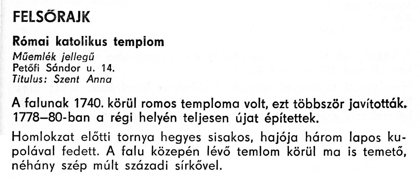 Nyilvános 2514 | 4737 | Felsőrajk - Zala megye műemlékei 1977 055-056old | A részlet szövege: FELSŐRAJK Római katolikus templom Műemlék jellegű Petőfi Sándor u. 14. Titulus: Szent Anna A falunak 1740. körül romos temploma volt, ezt többször javították. 1778–80-ban a régi helyén teljesen újat építettek. Homlokzat előtti tornya hegyes sisakos, hajója három lapos kupolával fedett. A falu közepén lévő temlom körül ma is temető, néhány szép múlt századi sírkővel. A részlet a következő könyvből származik: Cím: Zala megye műemlékei Szerző: Németh József (1928) Közreműködő: Lantos Miklós (fotó) Szerz. közl.: Németh József ; [fotók... Lantos Miklós] Kiadás: Zalaegerszeg : Zalai Ny., 1977 ETO jelzet: 72(439.121) ; 7.025.3/.4 ; 908.439.121 Tárgyszó: Zala megye Szakjelzet: 908 Cutter: N 53 Nyelv: magyar Oldalszám: 109 p. |