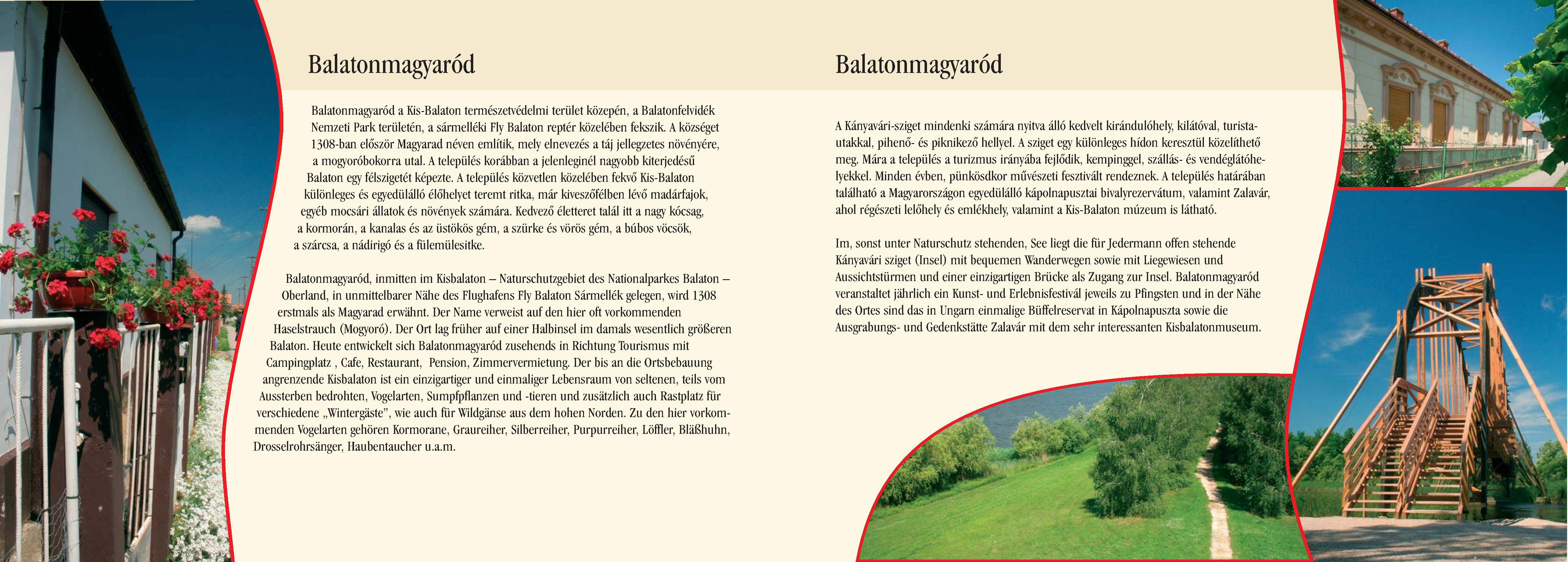 Nyilvános 2622 | 7054 | Balatonmagyaród | Balatonmagyaród, inmitten im Kisbalaton Naturschutzgebiet des Nationalparkes Balaton Oberland, in unmittelbarer Nähe des Flughafens Fly Balaton Sármellék gelegen, wird 1308 erstmals als Magyarad erwähnt. Der Name verweist auf den hier oft vorkommenden Haselstrauch (Mogyoró). Der Ort lag früher auf einer Halbinsel im damals wesentlich größeren Balaton. Heute entwickelt sich Balatonmagyaród zusehends in Richtung Tourismus mit Campingplatz , Cafe, Restaurant, Pension, Zimmervermietung. Der bis an die Ortsbebauung angrenzende Kisbalaton ist ein einzigartiger und einmaliger Lebensraum von seltenen, teils vom Aussterben bedrohten, Vogelarten, Sumpfpflanzen und -tieren und zusätzlich auch Rastplatz für verschiedene ,,Wintergäste", wie auch für Wildgänse aus dem hohen Norden. Zu den hier vorkommenden Vogelarten gehören Kormorane, Graureiher, Silberreiher, Purpurreiher, Löffler, Bläßhuhn, Drosselrohrsänger, Haubentaucher u.a.m. Im, sonst unter Naturschutz stehenden, See liegt die für Jedermann offen stehende Kányavári sziget (Insel) mit bequemen Wanderwegen sowie mit Liegewiesen und Aussichtstürmen und einer einzigartigen Brücke als Zugang zur Insel. Balatonmagyaród veranstaltet jährlich ein Kunst- und Erlebnisfestivál jeweils zu Pfingsten und in der Nähe des Ortes sind das in Ungarn einmalige Büffelreservat in Kápolnapuszta sowie die Ausgrabungs- und Gedenkstätte Zalavár mit dem sehr interessanten Kisbalatonmuseum. Dieses Text stammt von: Pannonhát tájpark prospektus 2006. Web: http://www.pannonhat.hu/ (auch in Deutsch) |