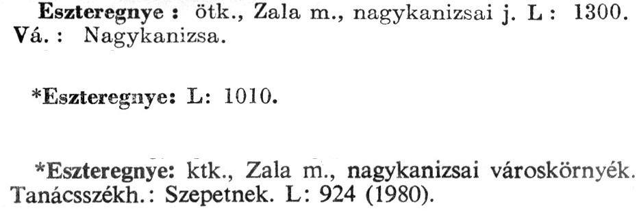 Nyilvános 2744 | 7006 | A szócikkek felismertetett szövege: | (Az első csillag után az 1972-es, a második csillag után az 1981-es kiadású kiegészítő kötetből származó szöveg következik) Eszteregnye : ötk., Zala m., nagykanizsai j. L : 1300. Vá. : Nagykanizsa. *Eszteregnye: L: 1010. *Eszteregnye: ktk., Zala m., nagykanizsai városkörnyék. Tanácsszékh.: Szepetnek. L: 924 (1980). A szócikkek a következő lexikonból származnak: Cím: Új magyar lexikon Közreműködő: Berei Andor (1900-1979) (szerk.) Szerz. közl.: [szerk. Berei Andor et al.] Kiadás jelzés: 2. lny. Kiadás: Budapest : Akad. K., 1961-1962 Kötetei: 1., A - C 2., D - F 3., G - J 4., K - Me 5., Mf - R 6., S - Z 7. köt., A-Z Kiegészítő kötet (1972) Kiegészítő kötet, 1962÷1980 (1981) ETO jelzet: 03=945.11 Szakjelzet: 030 Cutter: U 28 Nyelv: magyar Megjegyzés: Bibliogr. a címszavak egy részének végén |
