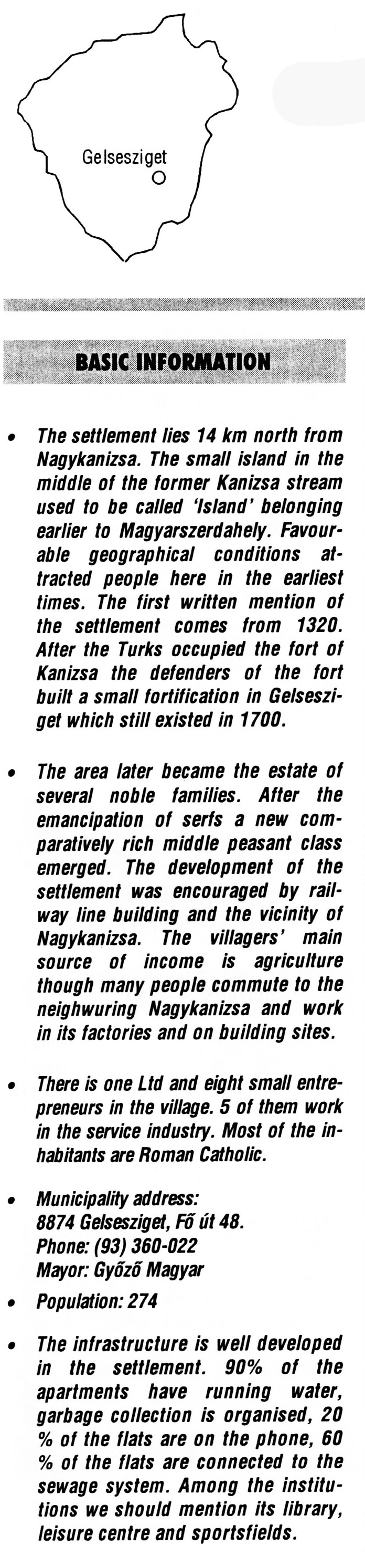 Nyilvános 2603 | 7026 | Rövid leírás | Teljes leírás (1.98 KB) | Gelsesziget BASIC INFORMATION • The settlement lies 14 km north from Nagykanizsa. The small island in the middle of the former Kanizsa stream used to be called \'Island\' belonging earlier to Magyarszerdahely. Favourable geographical conditions attracted people here in the earliest times. The first written mention of the settlement comes from 1320. After the Turks occupied the fort of Kanizsa the defenders of the fort built a small fortification in Gelsesziget which still existed in 1700. • The area later became the estate of several noble families. After the emancipation of serfs a new comparatively rich middle peasant class emerged. The development of the settlement was encouraged by railway line building and the vicinity of Nagykanizsa. The villagers\' main source of income is agriculture though many people commute to the neighwuring Nagykanizsa and work in its factories and on building sites. • There is one Ltd and eight small entrepreneurs in the village. 5 of them work in the service industry. Most of the inhabitants are Roman Catholic. • Municipality address: 8874 Gelsesziget, Fő út 48. Phone: (93) 360-022 Mayor: Győző Magyar • Population: 274 • The infrastructure is well developed in the settlement. 90% of the apartments have running water, garbage collection is organised, 20 % of the flats are on the phone, 60 % of the flats are connected to the sewage system. Among the institutions we should mention its library, leisure centre and sportsfields. This text came from the following book: Title: Handbook of Zala county (Zala megye kézikönyve) Series: County handbooks of Hungary (Magyarország megyei kézikönyvei) Chief editor: Hóbor József Publisher: (Hatvan), CEBA-Hungary Ltd, 1998 ETO: 908.439.121(035) ; 050.8(439.121) ISBN: 963-9089-18-2 Pages: 488-1040 p. Remark: Closed on: 1998. márc. 31. |