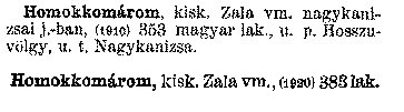 Nyilvános 2697 | 6358 | Homokkomárom, kisk. Zala vm. nagykanizsai j.-ban, (1910) 353 magyar lak., u. p. Hosszuvölgy, u. t. Nagykanizsa. Homokkomárom kisk. Zala vm., (1920) 383 lak. Cím: Révai nagy lexikona Alcím: az ismeretek enciklopédiája Kiadás: Budapest : Révai testvérek, [1911]- Kötetei: 1. köt., A - Arany 2. köt., Arány - Beke 3. köt., Béke - Brutto 4. köt., Bratus - Csát 5. köt., Csata - Duc 6. köt., Duc - Etele 7. köt., Stelka - Földöv 8. köt., Földpálya - Gres 9. köt., Gréc - Herold 10. köt., Hérold - Jób 11. köt., Jób - Nontur 12. köt., Kontúr - Lovas 13. köt., Lovas - Mons 14. köt., Mens - Ottó 15. köt., Ottó - Racine 16. köt., Racine - Sodoma 17. köt., Sodoma - Tarján 18. köt., 19. köt., Vár - Zsüri | Kiegészítés Aachen - Beöthy 20. köt., Kiegészítés: Bér - Zsolt ETO jelzet: 03=945.11 Szakjelzet: 030 Cutter: R 62 Nyelv: magyar |