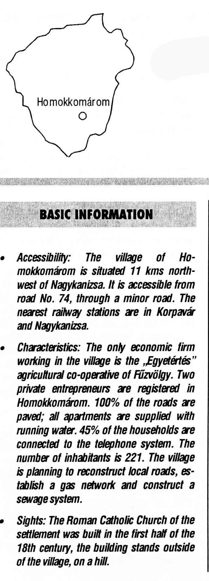 Nyilvános 2620 | 6887 | Homokkomárom | BASIC INFORMATION Accessibility: The village of Homokkomárom is situated 11 kms northwest of Nagykanizsa. It is accessible from road No. 74, through a minor road. The nearest railway stations are in Korpavár and Nagykanizsa. Characteristics: The only economic firm working in the village is the „Egyetértés” agricultural co-operative of Fűzvölgy. Two private entrepreneurs are registered in Homokkomárom. 100% of the roads are paved; all apartments are supplied with running water. 45% of the households are connected to the telephone system. The number of inhabitants is 221. The village is planning to reconstruct local roads, establish a gas network and construct a sewage system. Sights: The Roman Catholic Church of the settlement was built in the first half of the 18th century, the building stands outside of the village, on a hill. This text came from the following book: Title: Handbook of Zala county (Zala megye kézikönyve) Series: County handbooks of Hungary (Magyarország megyei kézikönyvei) Chief editor: Hóbor József Publisher: (Hatvan), CEBA-Hungary Ltd, 1998 ETO: 908.439.121(035) ; 050.8(439.121) ISBN: 963-9089-18-2 Pages: 488-1040 p. Remark: Closed on: 1998. márc. 31. |