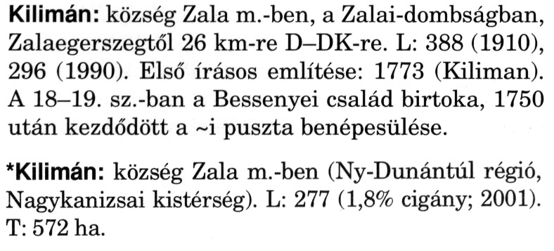 Nyilvános 2636 | 6651 | A szócikkek felismertetett szövege: | (A csillag után a kiegészítő kötetből származó szöveg következik) Kilimán: község Zala m.-ben, a Zalai-dombságban, Zalaegerszegtől 26 km-re D-DK-re. L: 388 (1910), 296 (1990). Első írásos említése: 1773 (Kiliman). A 18–19. sz.-ban a Bessenyei család birtoka, 1750 után kezdődött a ~i puszta benépesülése. *Kilimán: község Zala m.-ben (Ny-Dunántúl régió, Nagykanizsai kistérség). L: 277 (1,8% cigány; 2001). T: 572 ha. A szócikkek a következő lexikonból származnak: Cím: Magyar nagylexikon Közreműködő: Élesztős László (1949) (szerk.) ; Barabás Éva (1943) (szerk.) ; Berényi Gábor (1946) (szerk.) ; Bárány Lászlóné (szerk.) ; Adelmann-né Kertész Judit (1945) (közrem.) ; Froemel Károlyné Jáky Éva (1936) (közrem.) ; Akadémiai Kiadó és Nyomda Vállala Szerz. közl.: [... Élesztős László főszerk.] ; [szerk. Barabás Éva et al.] ; [bibliogr. Adelmanné Kertész Judit] ; [kész. az Akadémiai Kiadó Magyar Nagylexikon Szerkesztőségében] Kiadás: Budapest : Akad. K., 1993- Kötetei: 1. köt., A - Anc 2. köt., And - Bag 3. köt., Bah - Bij 4. köt., Bik - Bz 5. köt., C - Csem 6. köt., Csen - Ec 7. köt., Ed - Fe 8. köt., Ff - Gyep 9. köt., Gyer - Iq 10. köt., Ir - Kip 11. köt., Kir - Lem 12. köt., Len - Mep 13. köt., Mer - Nyk 14. köt., Nyl - Pom 15. köt., Pon - Sek 16. köt., Sel - Szö 17. köt., Szp - Ung 18. köt., Unh - Z 19. köt., Kiegészítő kötet, A - Z ETO jelzet: 030=945.11 Szakjelzet: 030 Cutter: M 14 ISBN: 963-05-6611-7 [!ISBN 963-05-6615-X] Nyelv: magyar Megjegyzés: Az 5. kötettől kiad. a Magyar Nagylexikon Kiadó ; A 6. kötettől főszerk. Berényi Gábor ; A 6. kötettől szakszerk. Bárány Lászlóné et al. ; A 6. kötettől bibliogr. Froemel Károlyné ; Bibliogr. a szócikkek végén |